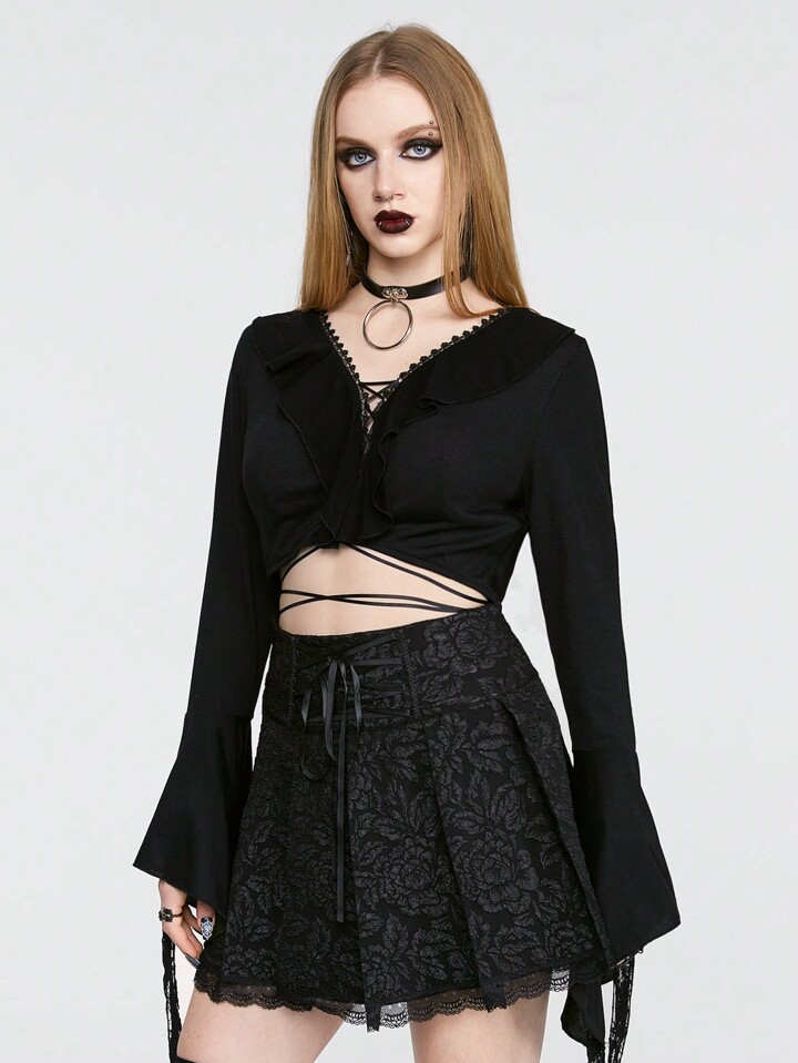 Goth ملابس علوية قصير بتصميم غوثي داكن مزين بطية عنق وأكمام واسعة