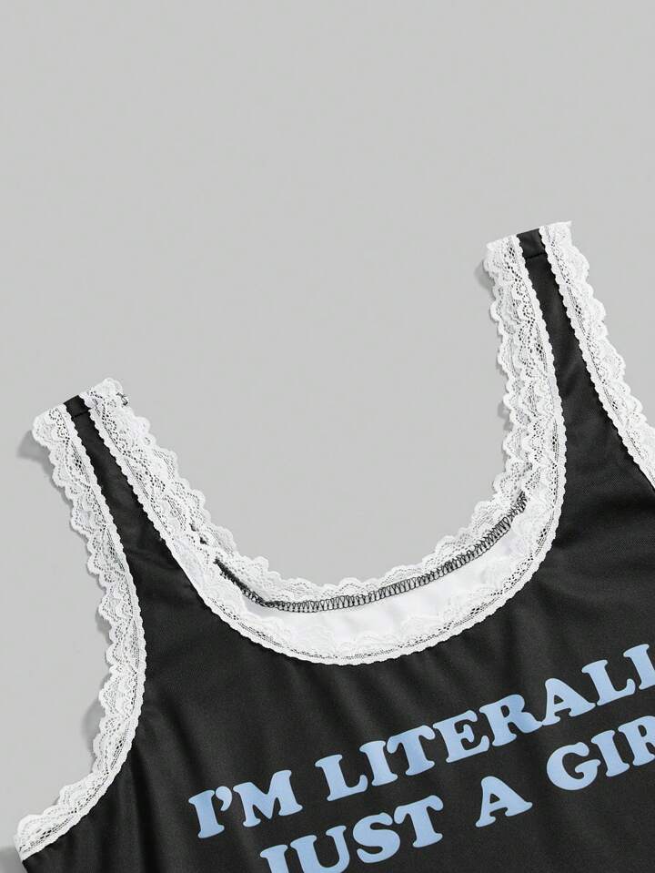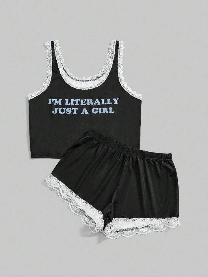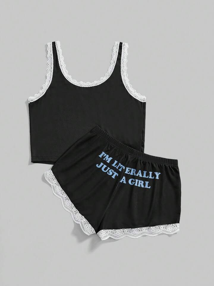 Goth طقم ملابس نوم من قميص وشورت، مزخرف بشعارات بخط جوتي والدانتيل للتباين