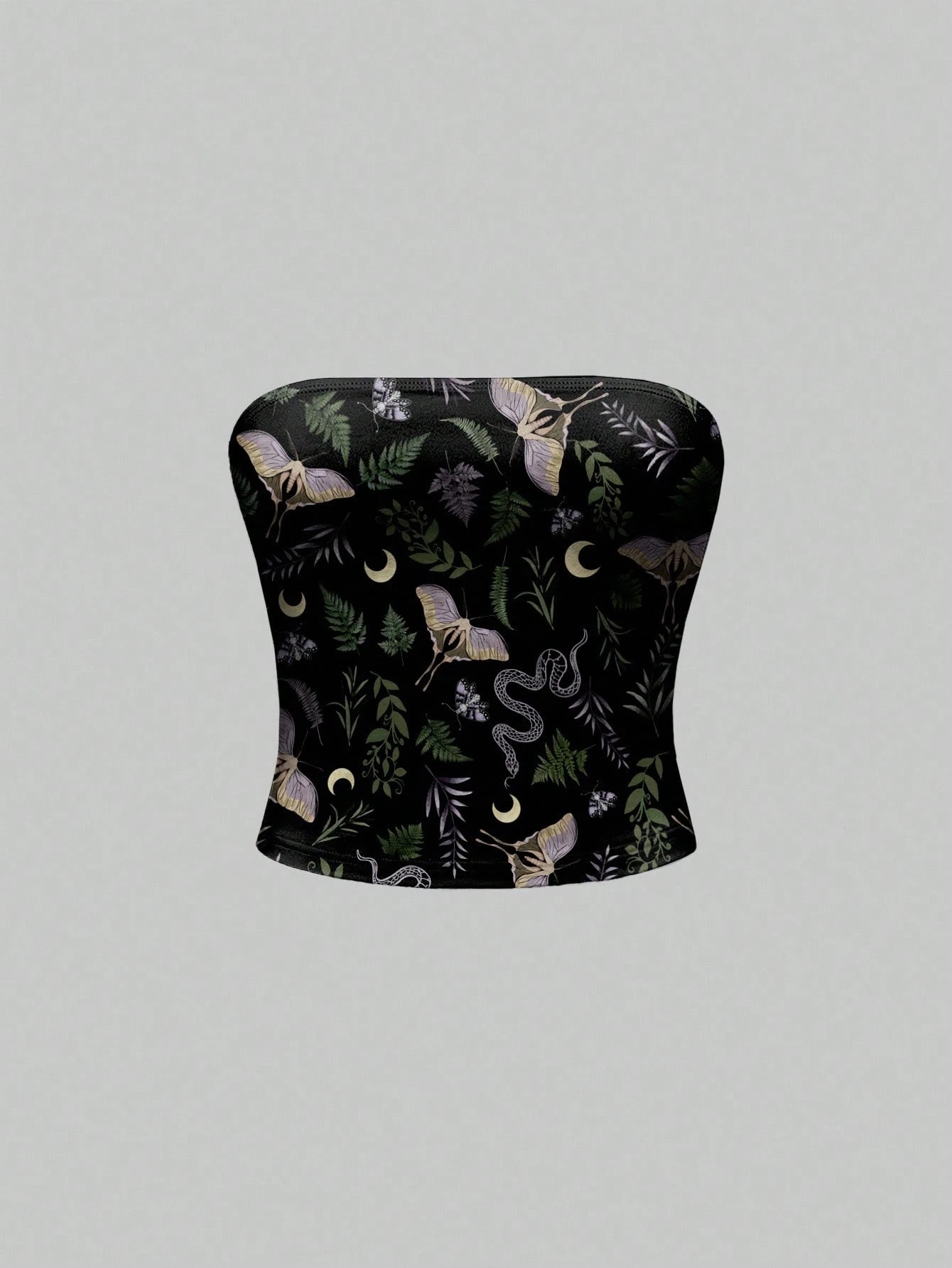 Goth ملابس علوية نسائي بدون أكتاف ذو طبعات غامضة لفراشة وخفاش وورقة وشمس وقمر، طراز غوثي مناسب لمناسبة هالوين