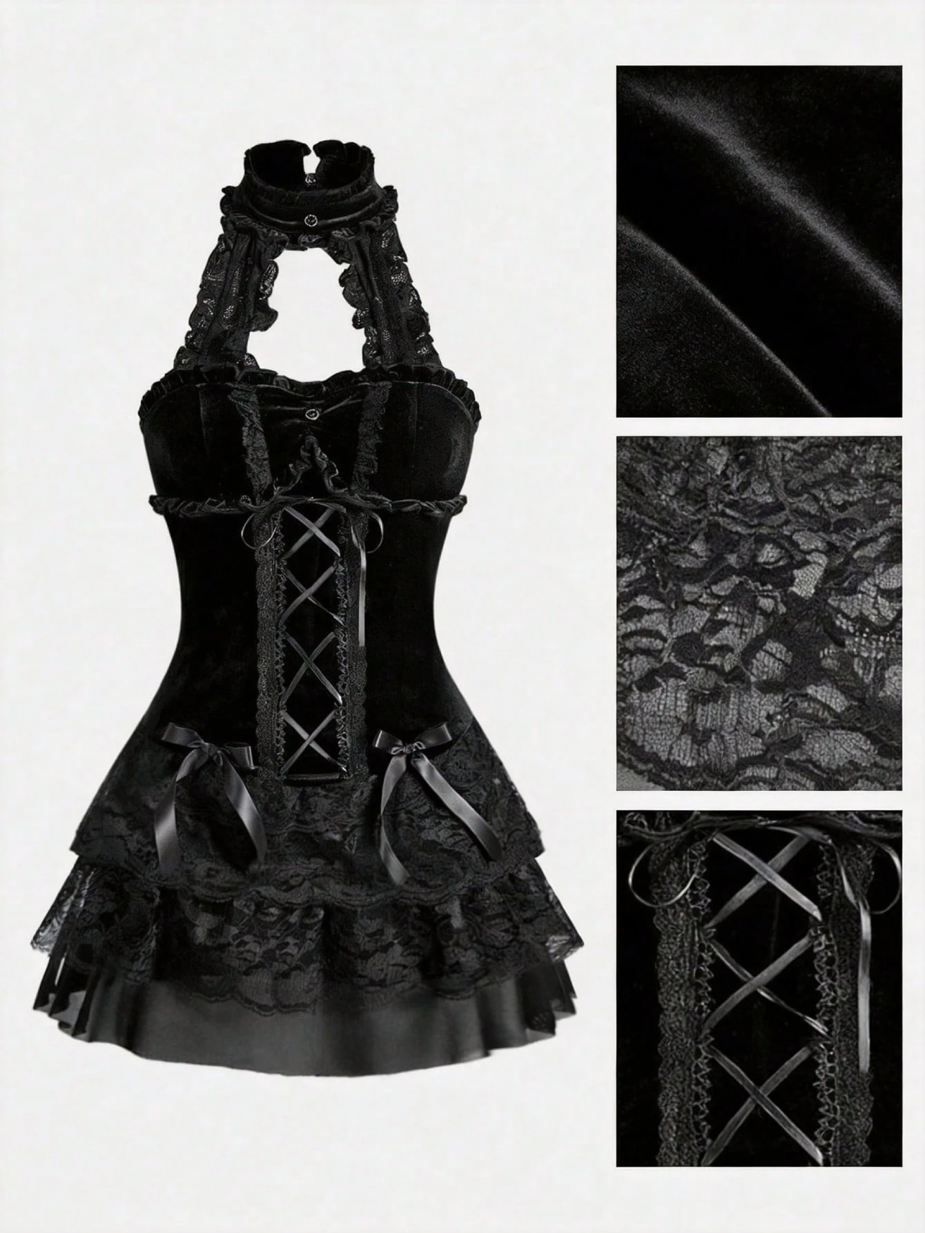 Goth فستان نسائي ذو خصر مربوط بشريط مزين بالدانتيل والكشكشة من القماش المخملي الفاخر بطراز قصر جوتيك رومانسي فاخر