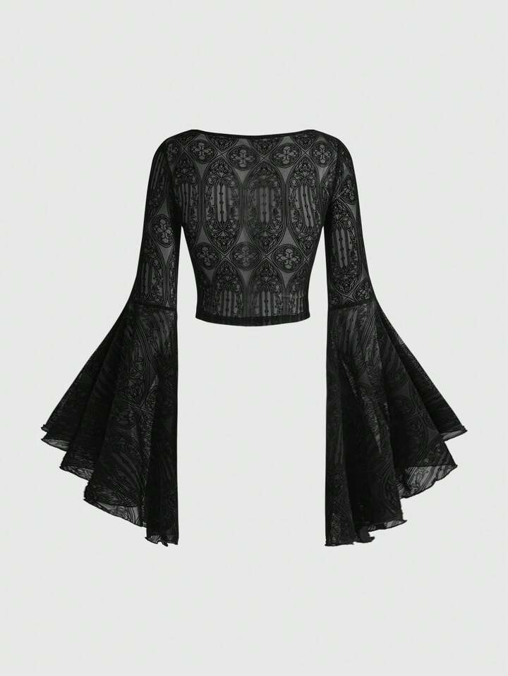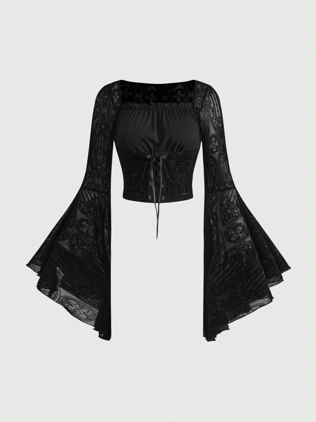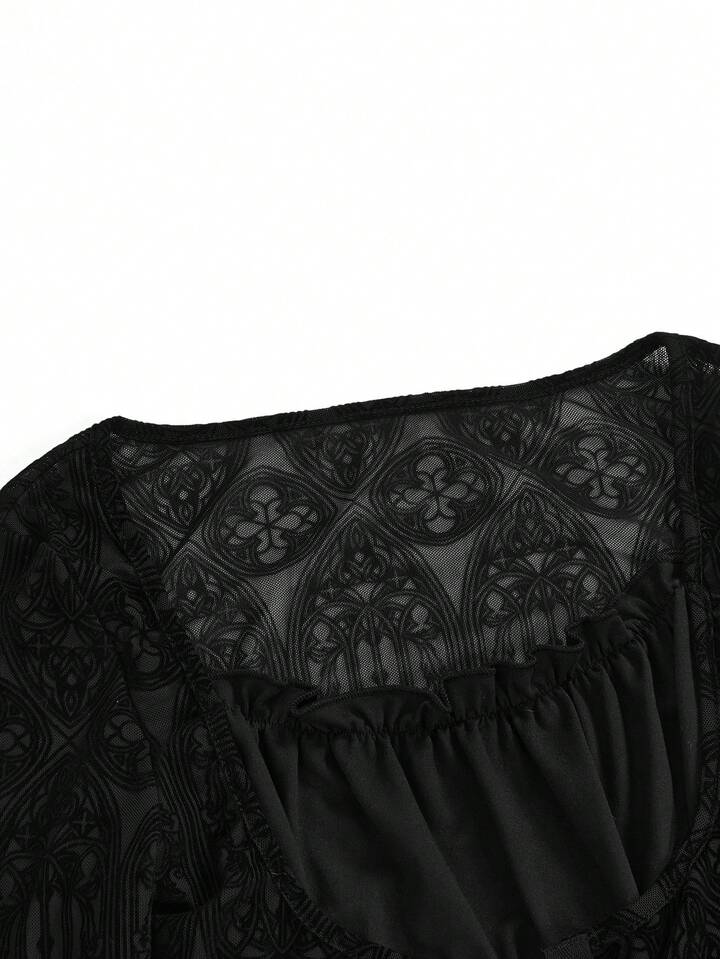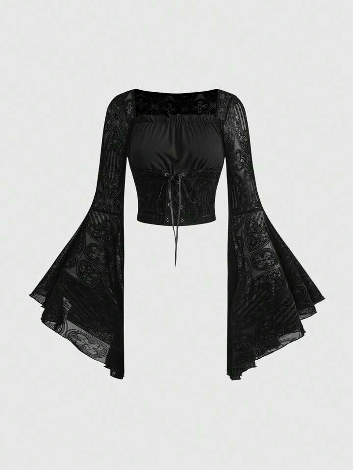 Goth بلوزة نسائية بطراز قصر جوتيك بتصميم مفرغ مع رقعة مخملية وشبكية ومزينة بالدانتيل