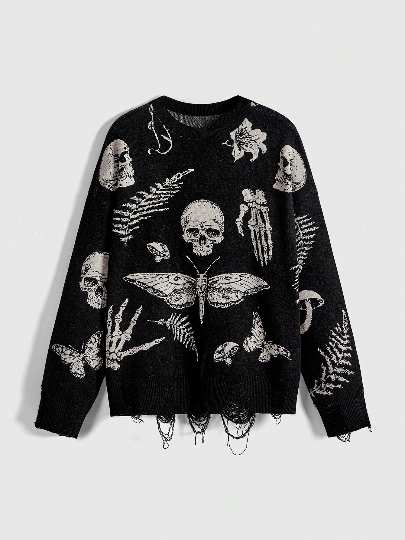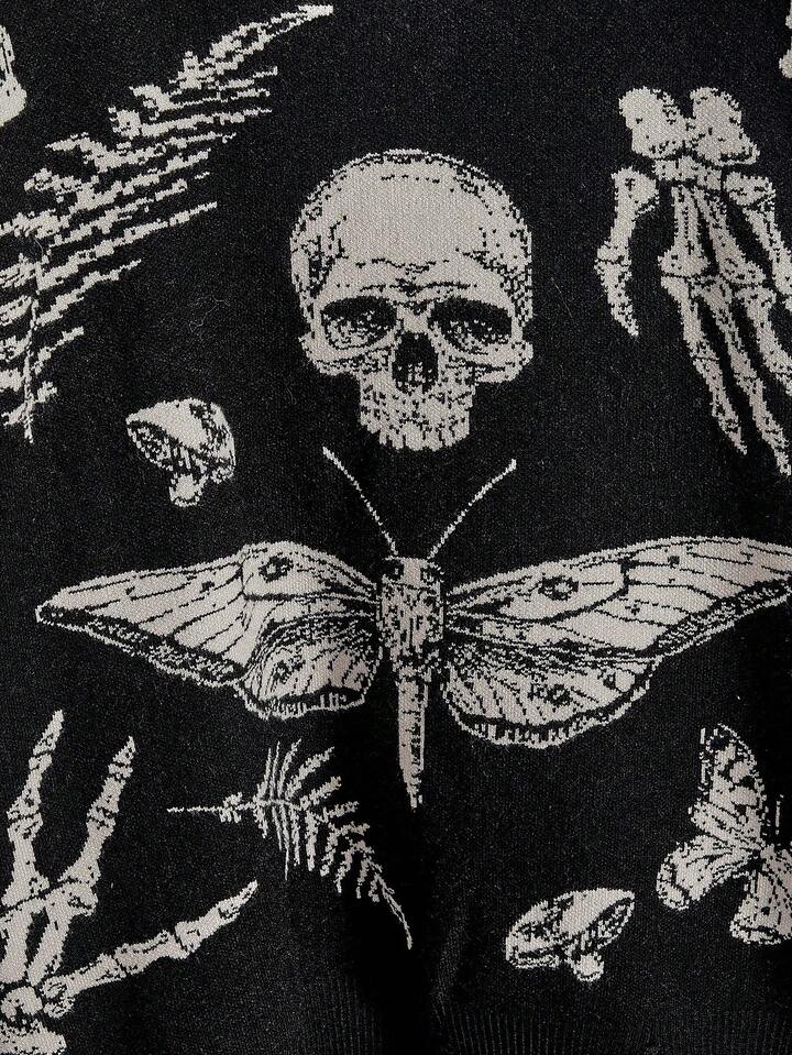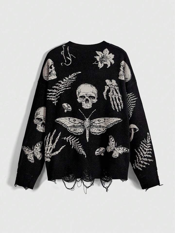 Goth كنزة صوفية كنزة فضفاضة بنقشة جاكارد بتصميم الجمجمة والفراشة الزهرية