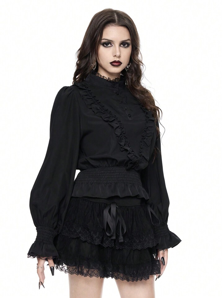 Goth قميص نسائي بأكمام فانوس مزين بالكشكشة على الطراز القوطي/القصري