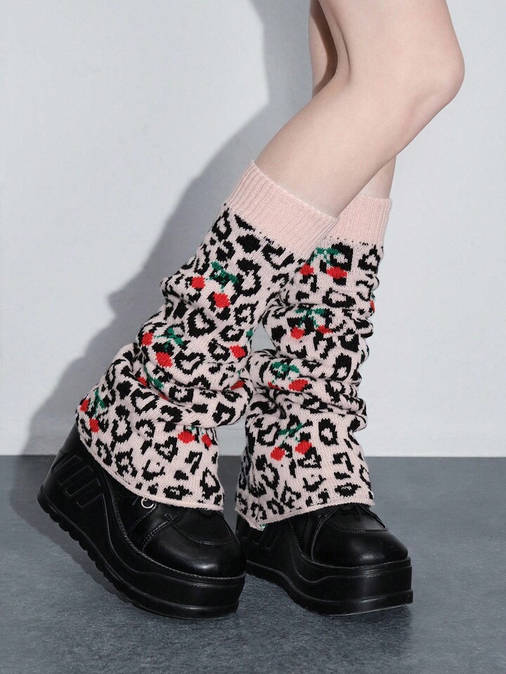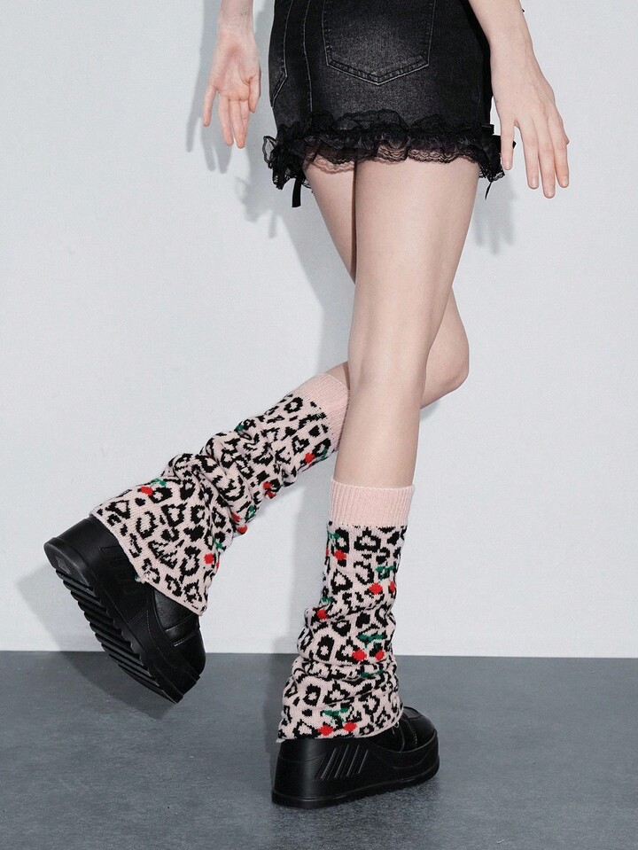 Grunge Punk زوج من دافئات الساق ذات الساق الواسعة بطبعة قلوب وفهد وكرز باللونين الوردي والأسود كيوت وكاواييي