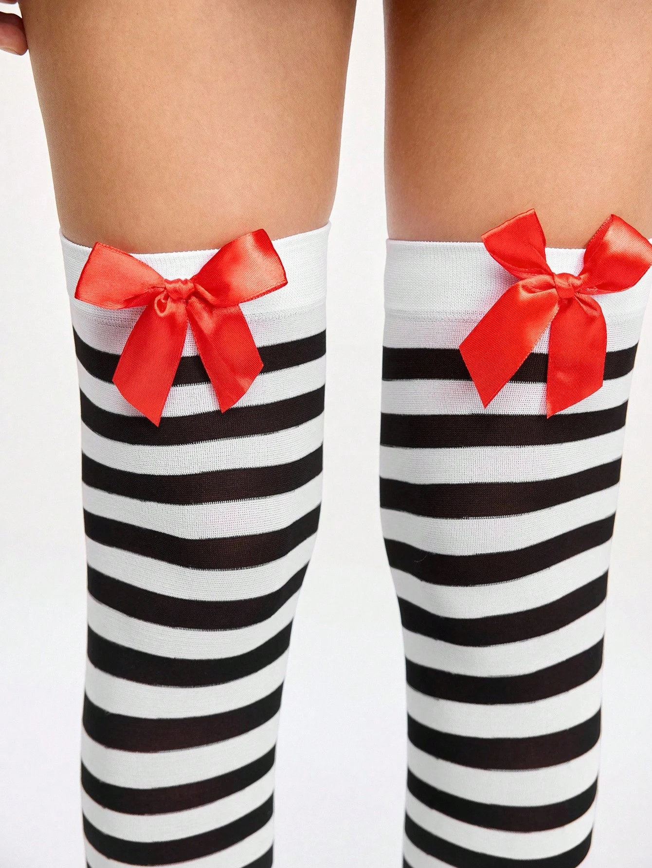 Grunge Punk زوج من الجوارب طويلة الساق ذات الخطوط السوداء والبيضاء مزينة بفيونكة حمراء بطراز جوثيك