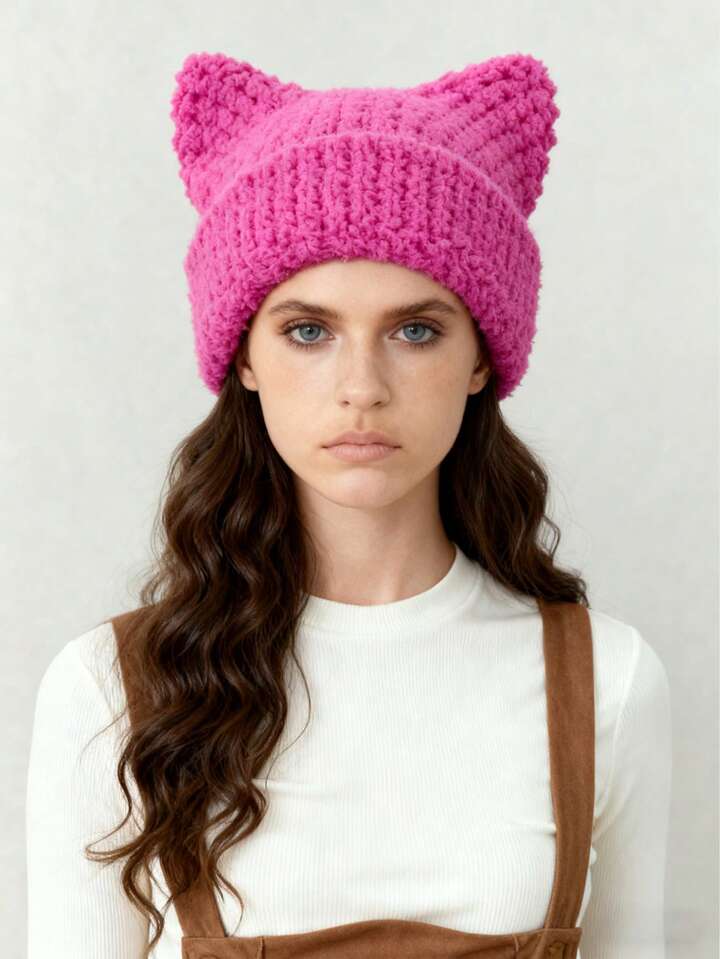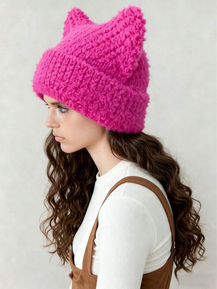 Grunge Punk قبعة بيني مضفرة بأذن قطة باللون الأرجواني، قبعة دافئة بلون أحادي بطراز Y2K، قبعة موضة متعددة الاستخدامات للارتداء اليومي