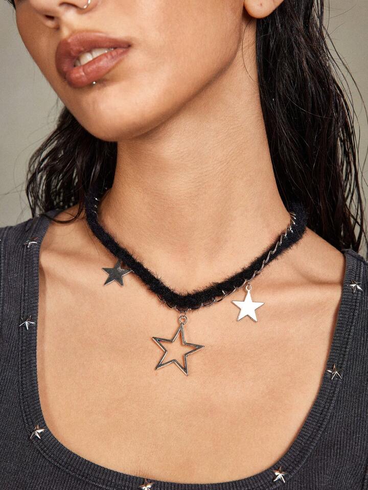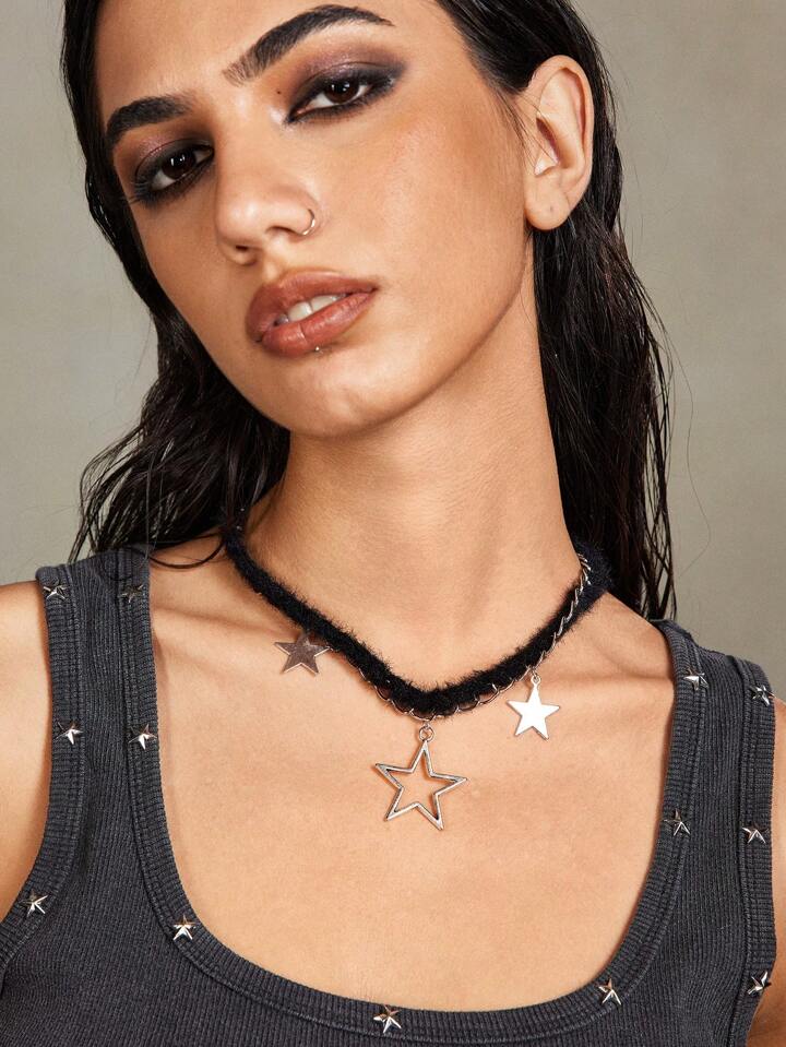 Grunge Punk 1 قطعة عقد خانق فضي بسلسلة هولو على الطراز الجوثي ذو قطعة نجمة هولو معلقة، مغطى بنسيج مخملي أسود، مناسب للنساء، هدية عيد