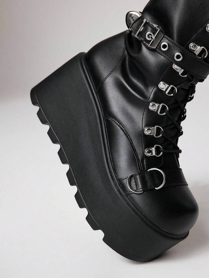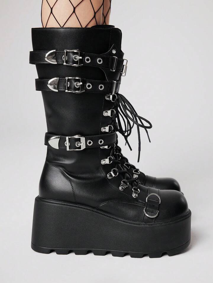 Grunge Punk بوت جلد جديد لخريف/شتاء 2025 بتصميم بانك بأصبع مستدير وسميك الأربطة والنعل، بوت أنيق للخارج يصل إلى منتصف الساق