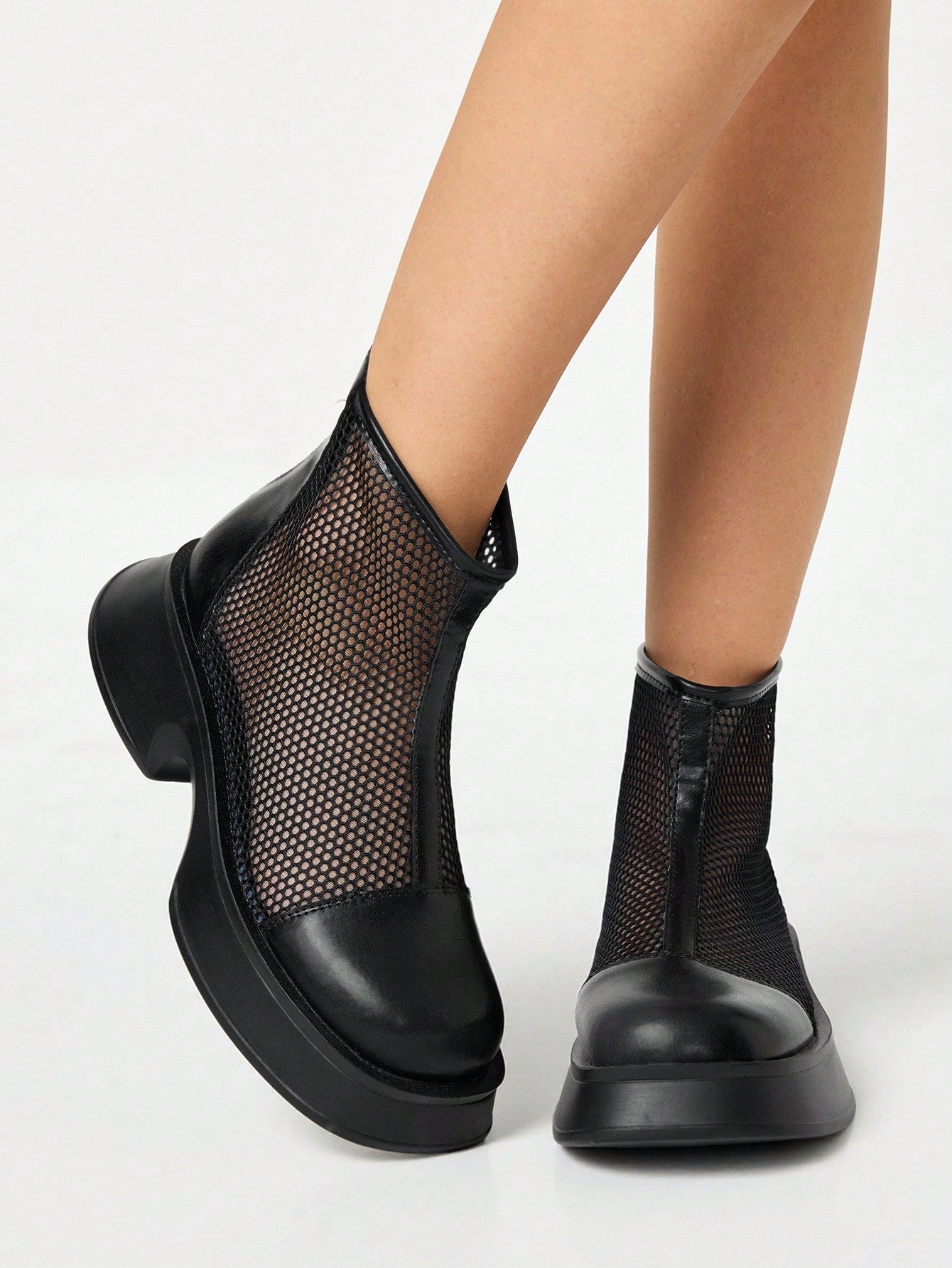 Grunge Punk بوت نسائي كوري جديد لعام 2025 من الجلد والشبك المنفذ للهواء، بتصميم منصة وطلابي