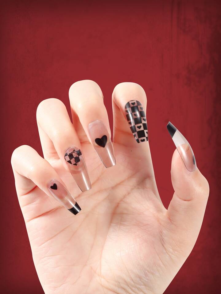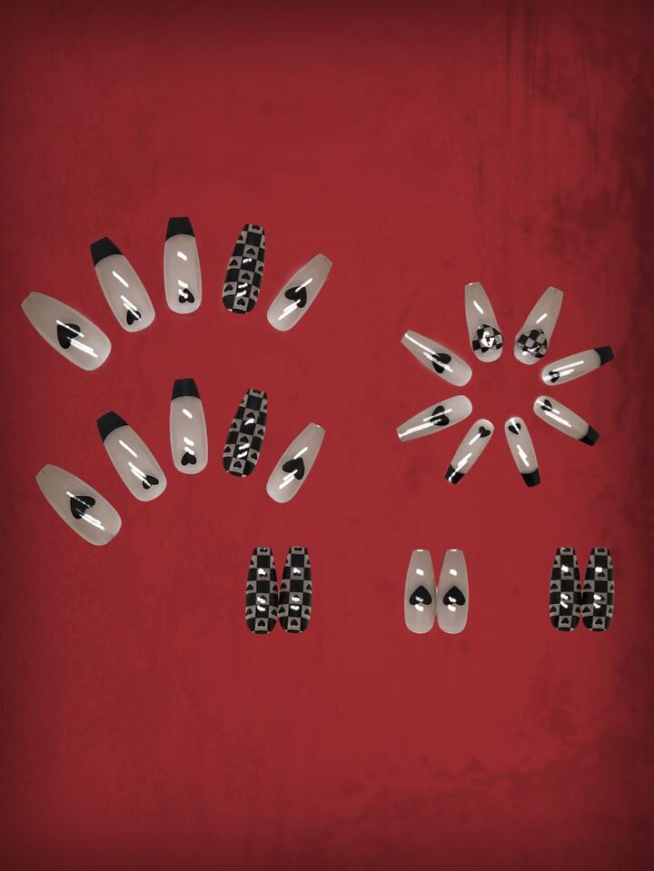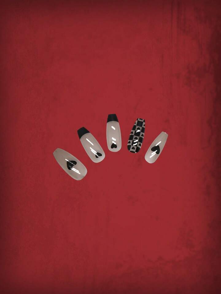 Grunge Punk 24 قطعة نعش بطباعة قلب أظافر اصطناعية و ورقة واحدة شريط