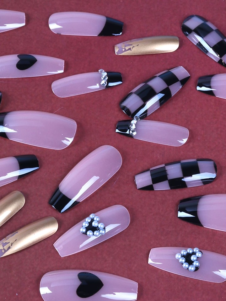Grunge Punk 24 قطعة قلب و طباعة مربع النقش أظافر اصطناعية و ورقة واحدة شريط