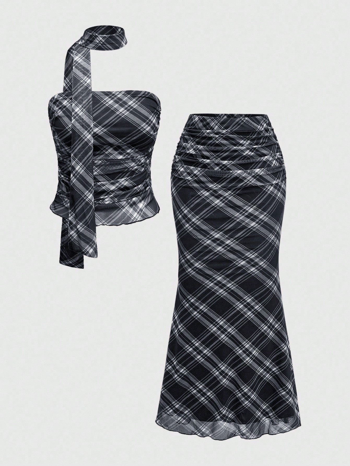 Grunge Punk مجموعة تتكون من 2 قطعة: توب أنبوبي مربع الطراز الرجعي وتنورة ذيل سمكة منخفضة الخصر مربعة الطراز الرجعي