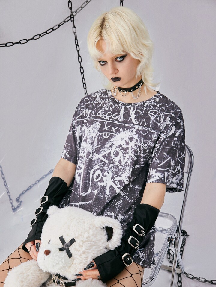 Grunge Punk تي شيرت منخفض الاكتاف طباعة شامل
