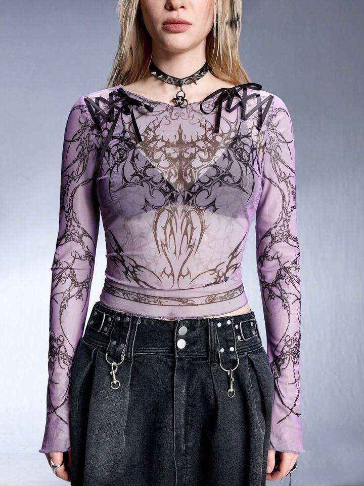 Grunge Punk توب قصير ضيق مطبوع بألوان متباينة، شبكي شفاف بتصميم شبك وأربطة أمامية