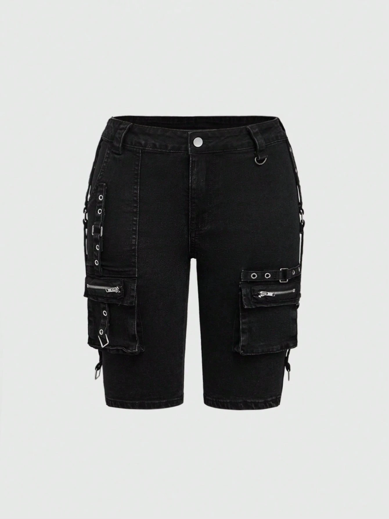 Grunge Punk بنطال جينز أنثوي نحيل قصير مزين بجيوب ومعادن ذات طابع قتامة وكارجو ، طول الركبة