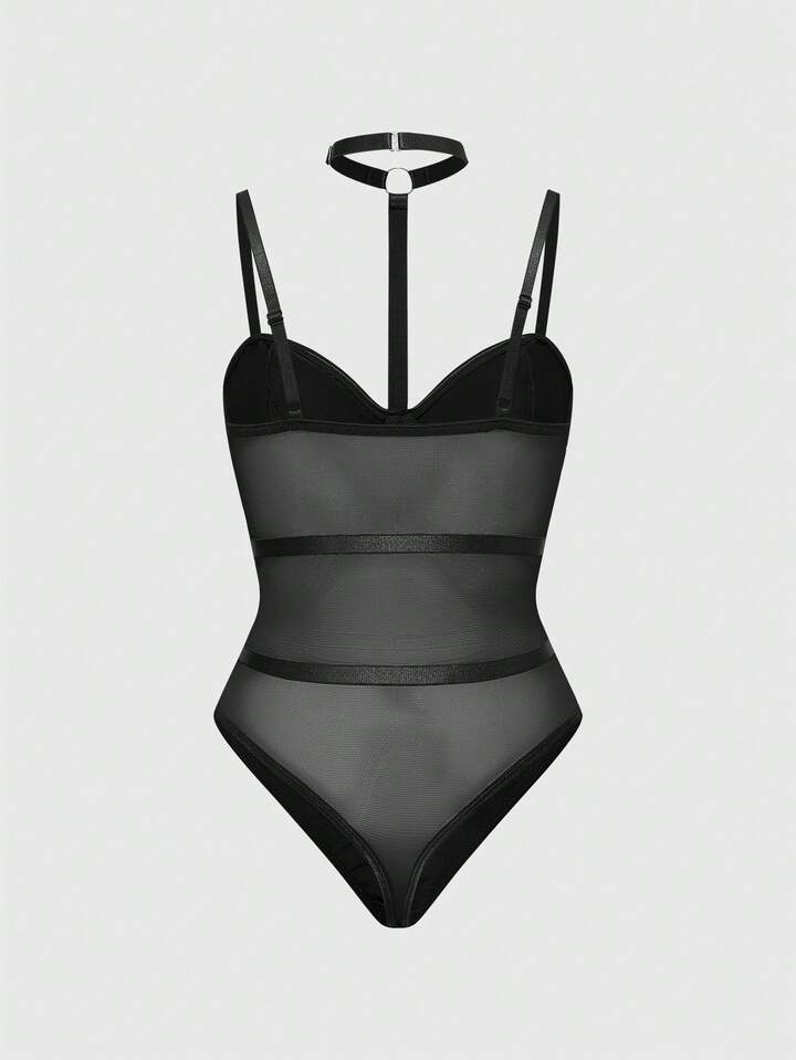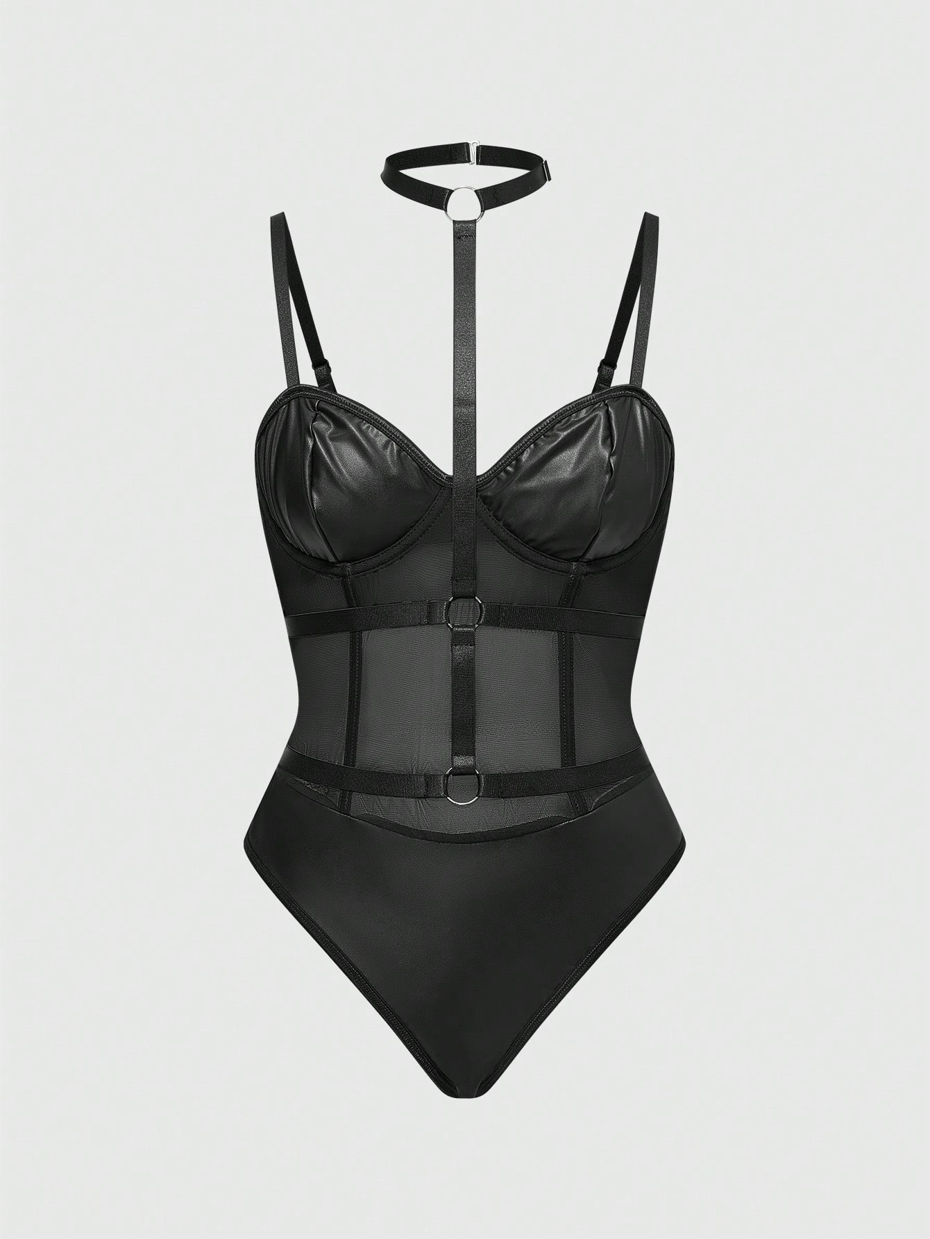 Grunge Punk بوديسوت جسم سكسية من الشبك والجلد الاصطناعي بحمالات سلكية، طراز بانك داكن