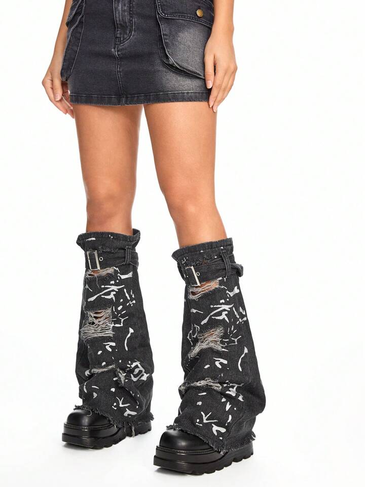 Grunge Punk ساق طويلة مريحة لإحماء الساقين مع تأثير الجينز المخدوش - تصميم ضيق للساق