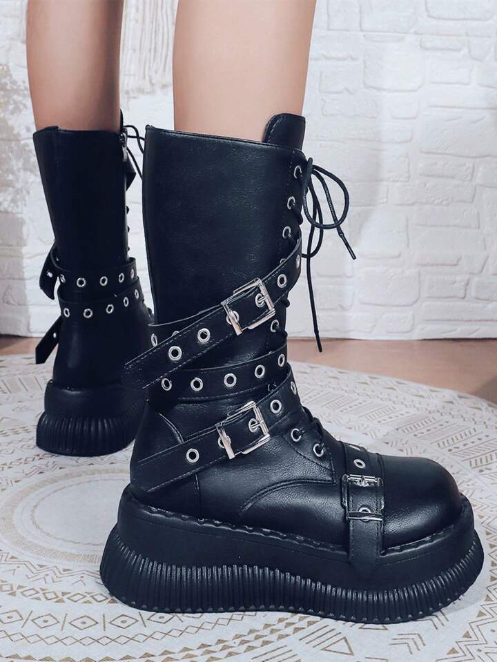 Grunge Punk أحذية نسائية بكعب عالي ومشبك معدني ونعل سميك وأسلوب بانك بأصابع مدورة وذوق أوروبي وأمريكي لفصلي الخريف والشتاء