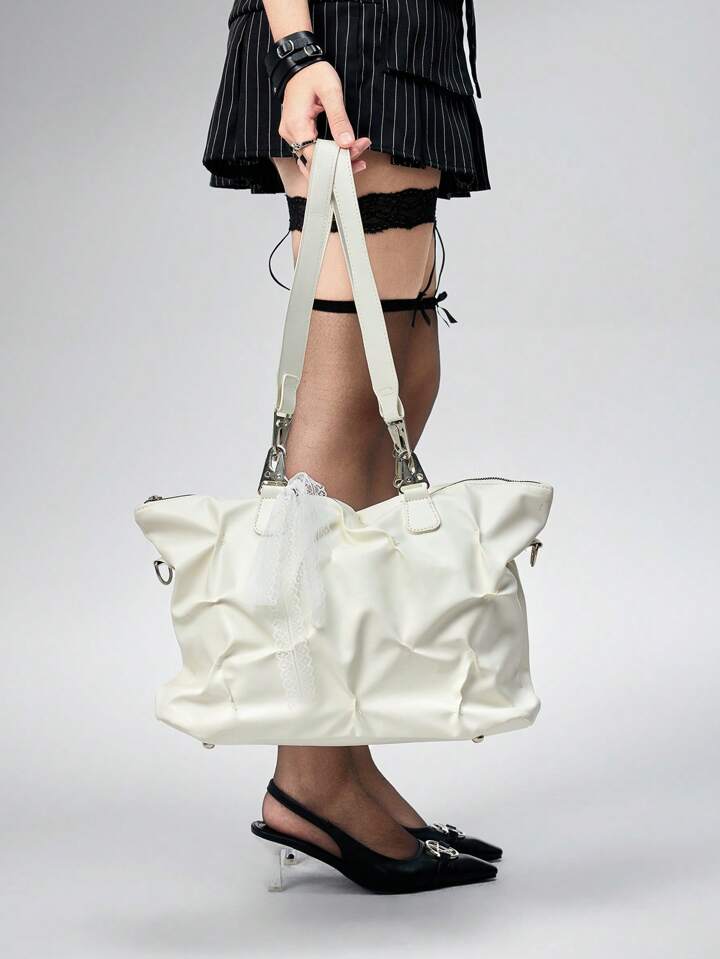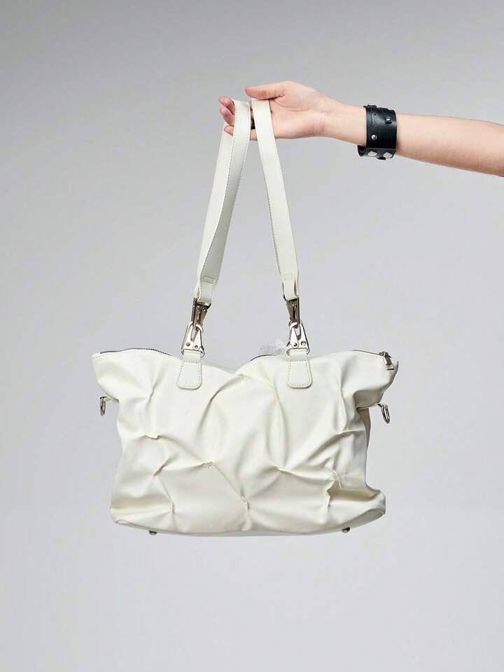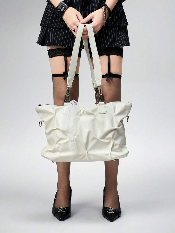 Grunge Punk حقيبة تسوق متعددة الاستخدامات ذات طيات عصرية، حقيبة كتف وعبر الجسم ذات سعة كبيرة للنساء، باللون الأبيض