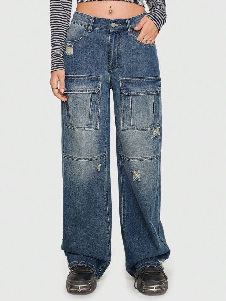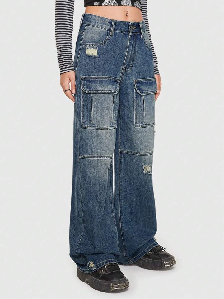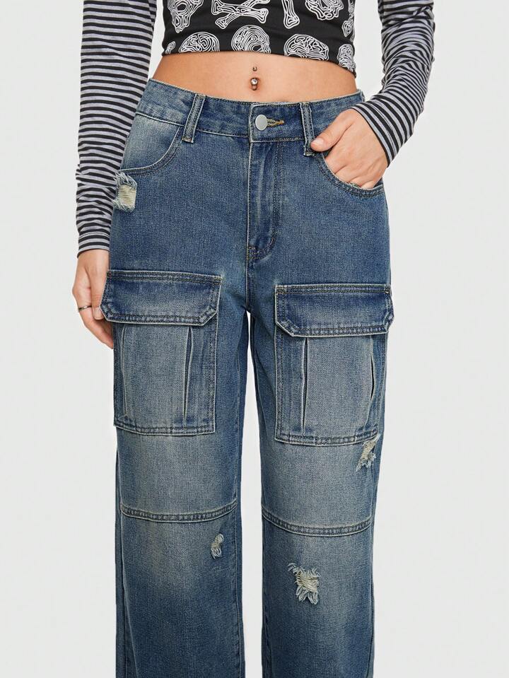 Grunge Punk جينز بساق مستقيم جيب قلاب ممزق