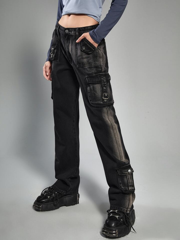 Grunge Punk بنطلون جينز كارجو جيب قلاب حزام تفاصيل