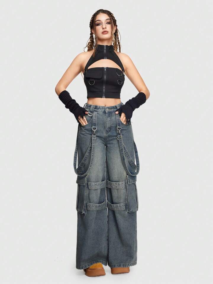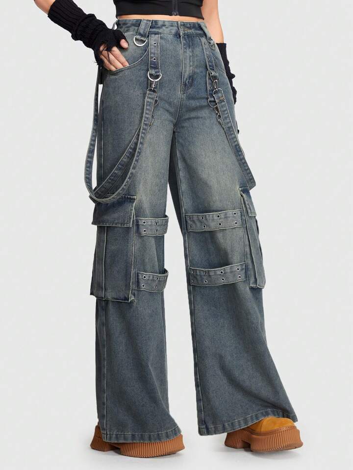 Grunge Punk جينز بقصة ساق واسعة بدون حزام مع جيب على الغطاء, المدرسة