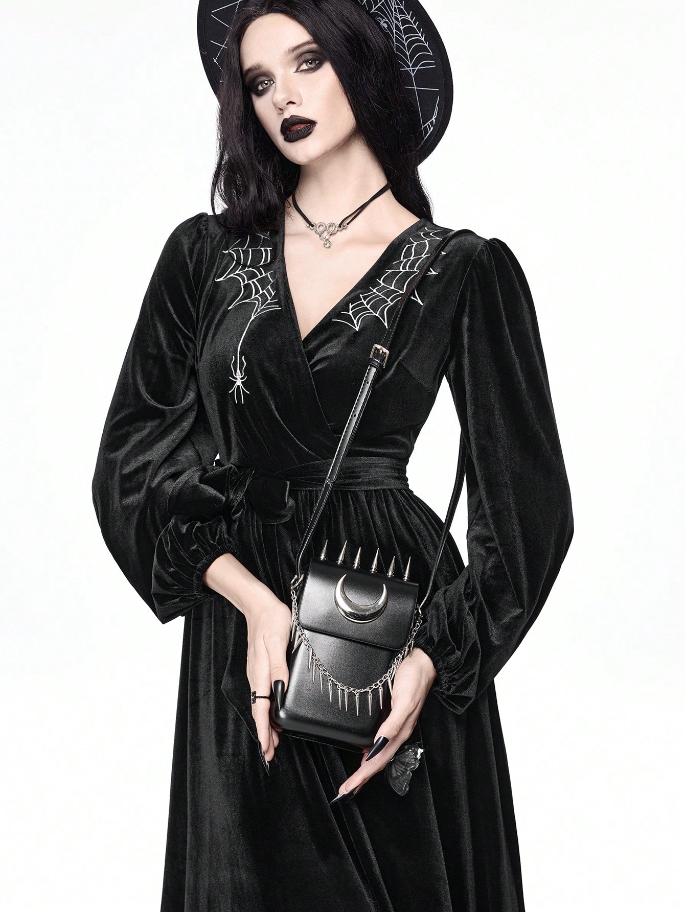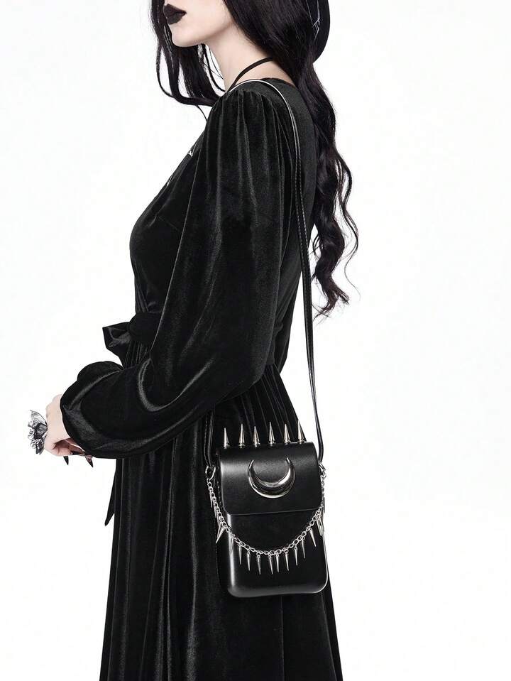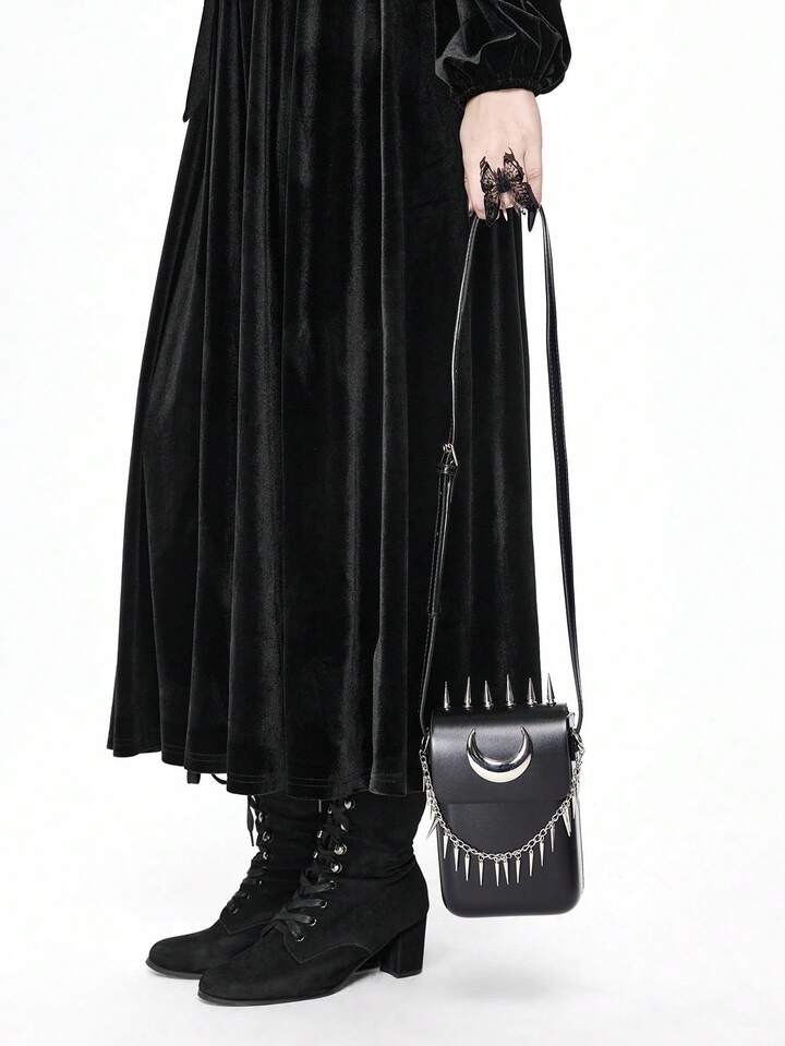 Grunge Punk حقيبة كروس بودي معدنية مزينة بهلال القمر الأسود، حقيبة كتف بنمط بانك Y2K للحفلات والخروجات الليلية والإطلالات اليومية