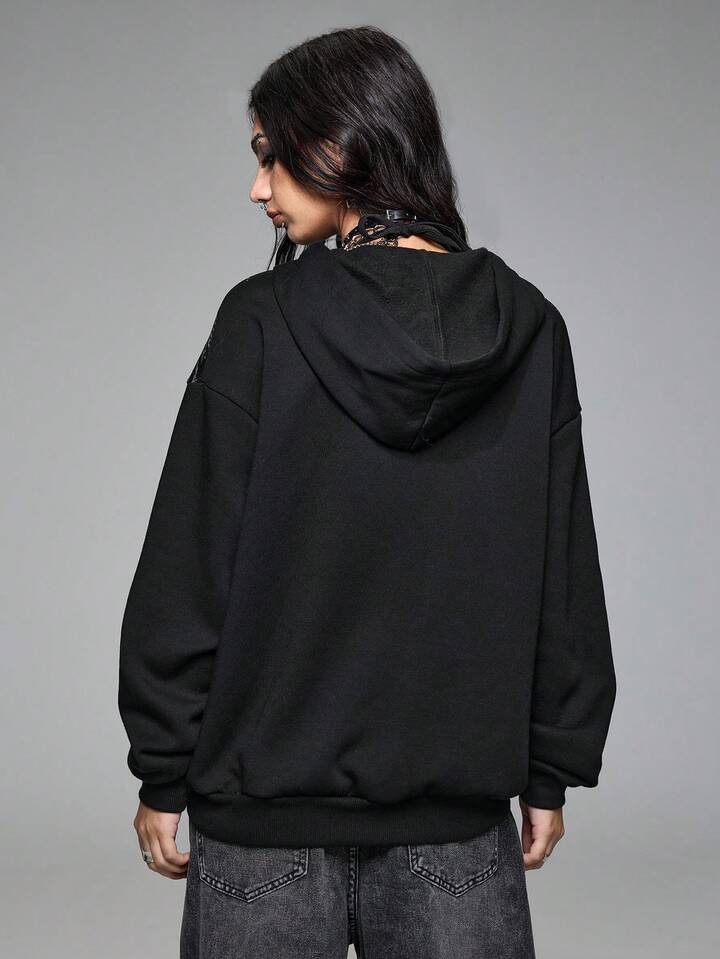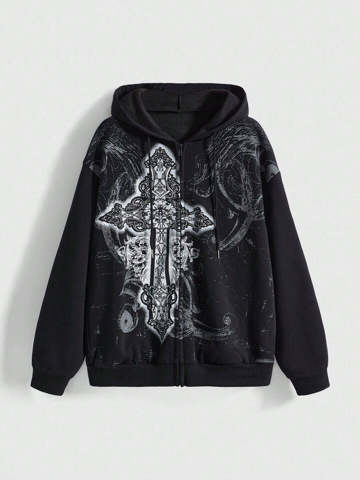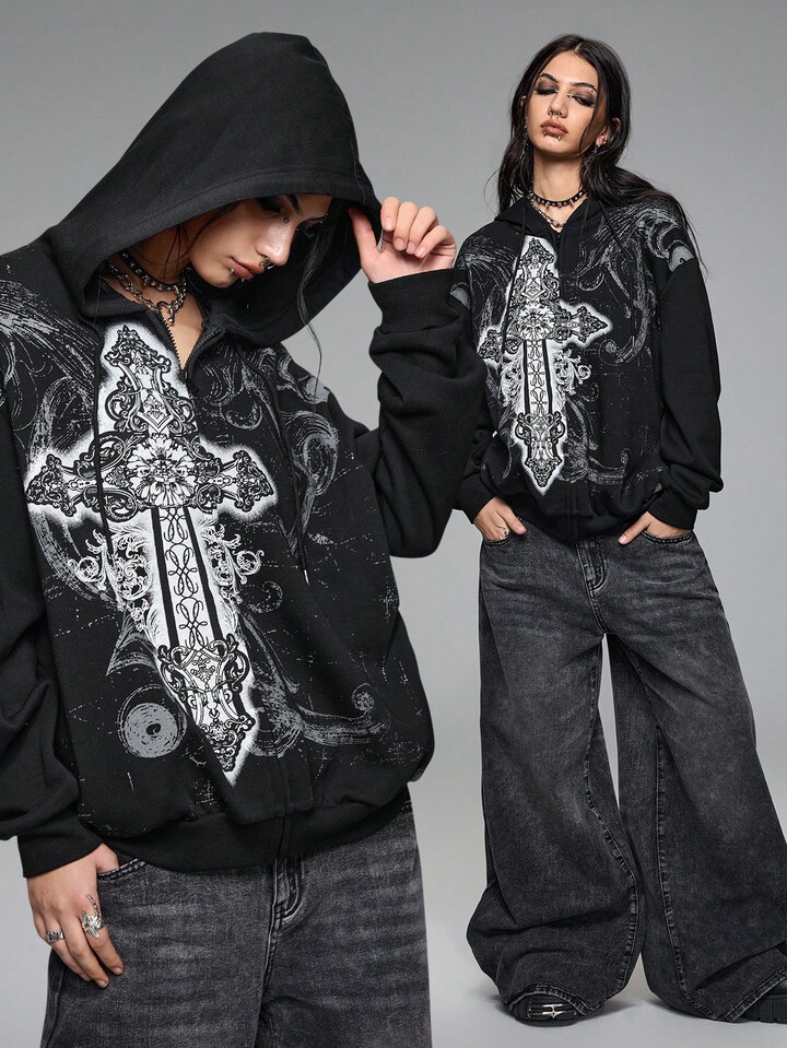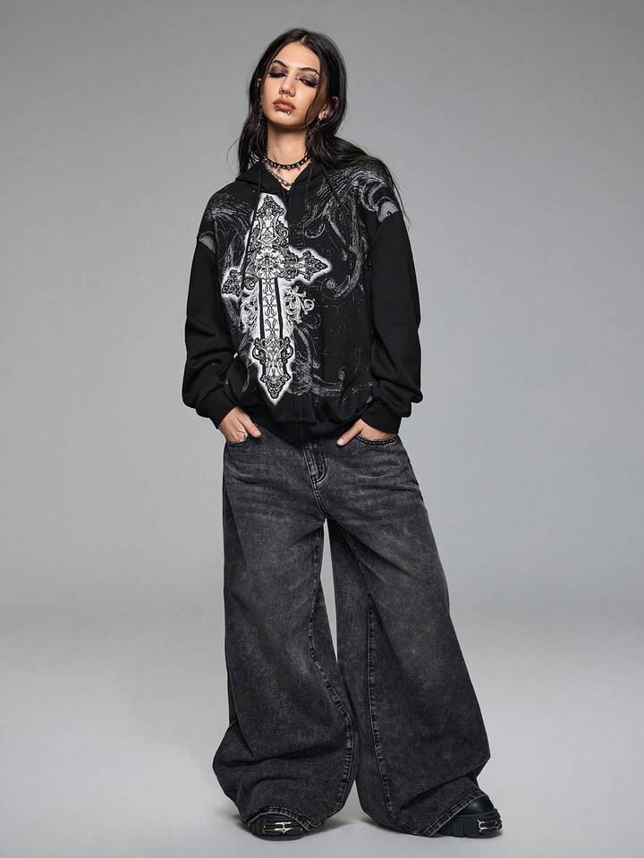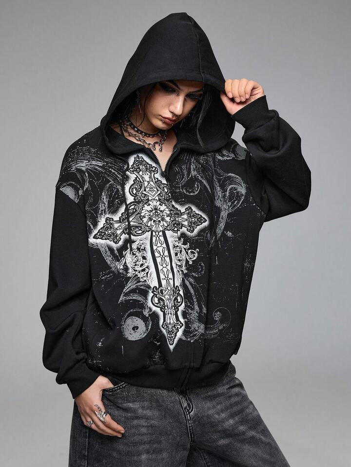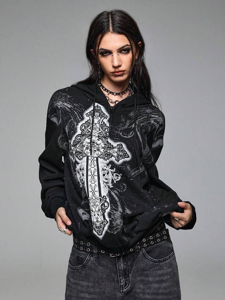 Grunge Punk هودي فضفاض مطبوع بنمط صليب على الطراز الجرانج للنساء