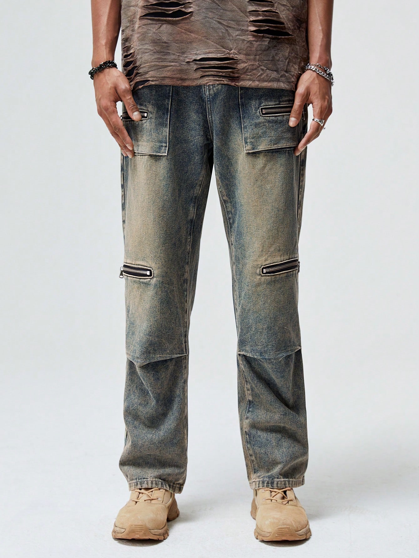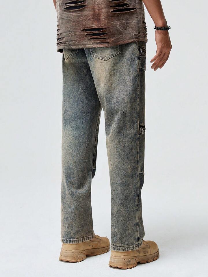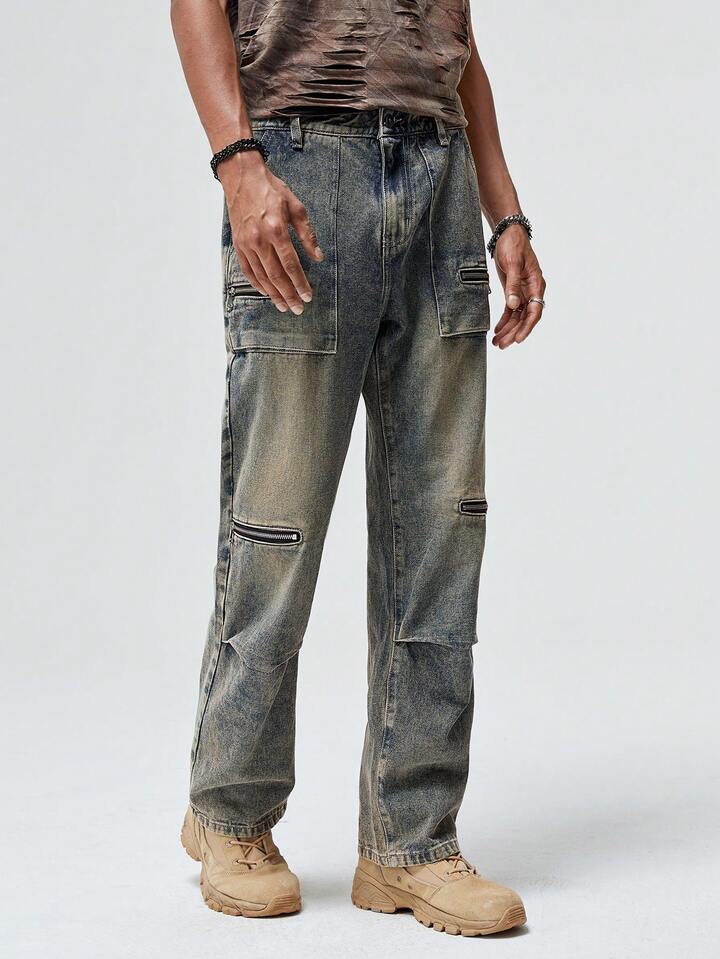 Grunge Punk بنطلون جينز كارجو قطن بتفاصيل سستة جيب قلاب للشباب