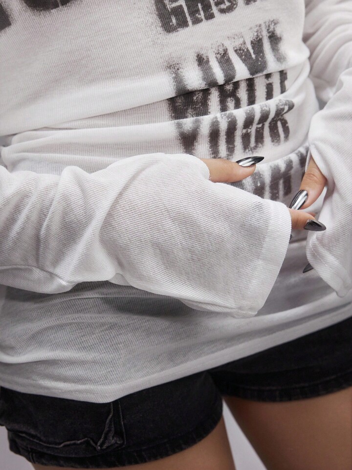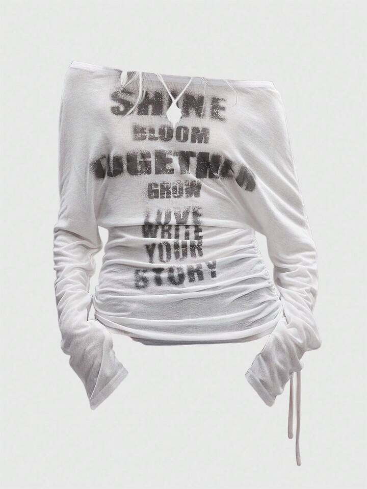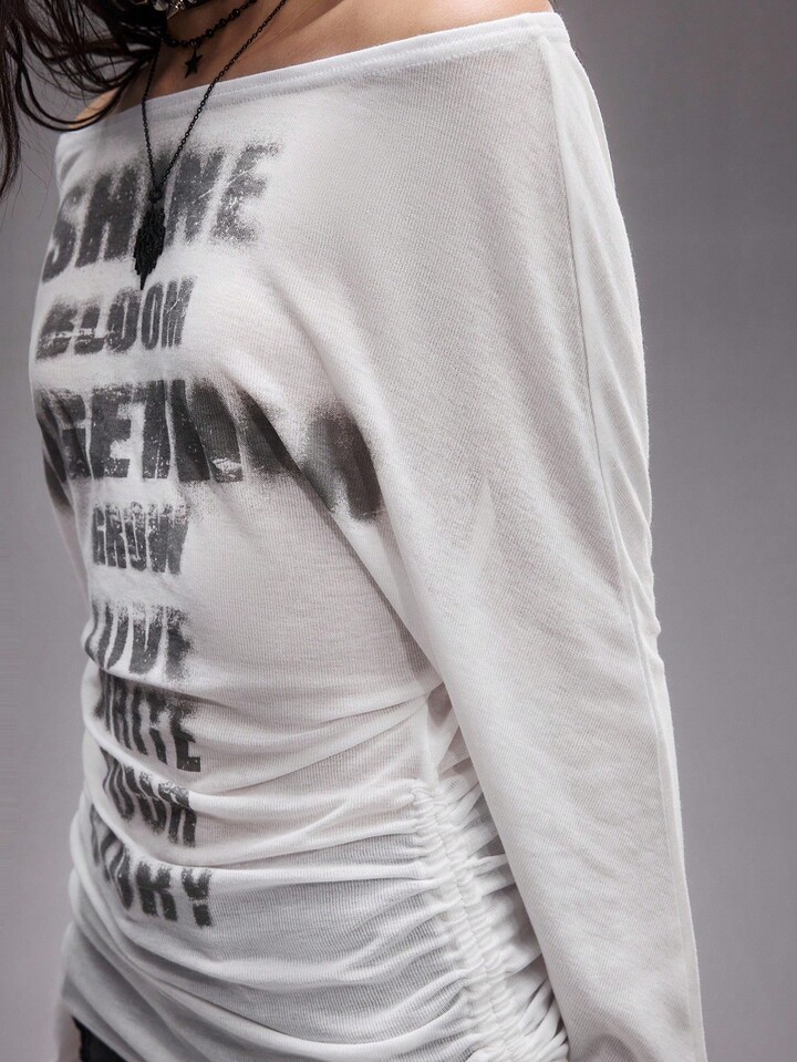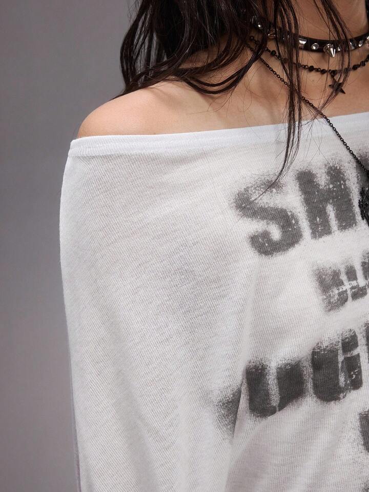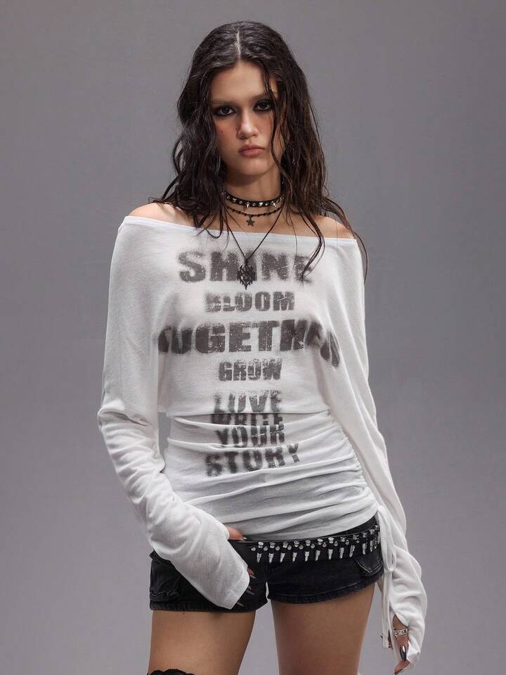 Grunge Punk قميص كم طويل للنساء بطبعة صليب وحرف رومانسي بطراز بانك أوف-الكتف