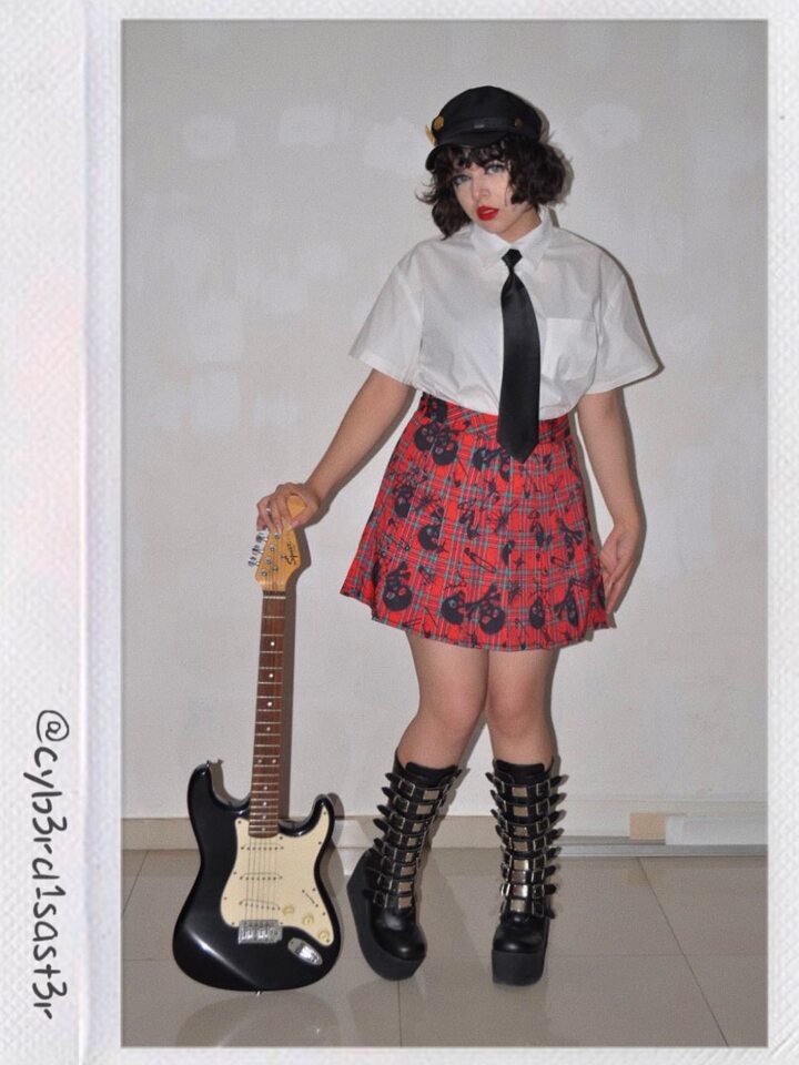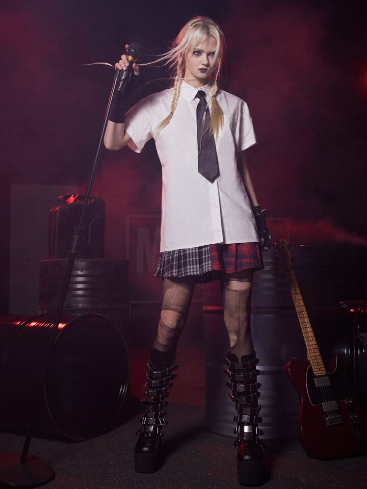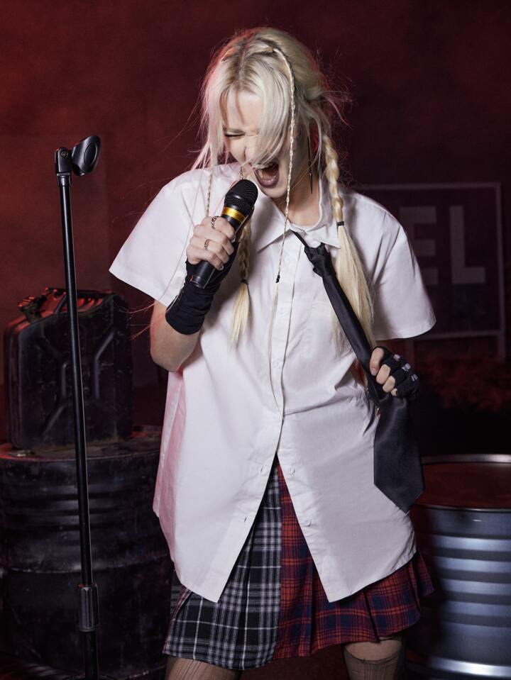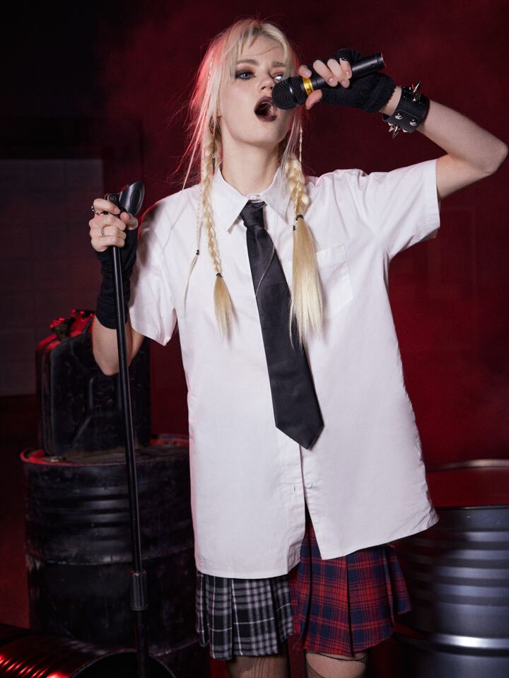 Grunge Punk قميص موحدة اللون أزرار أمامية بنمط Kpop مع ربطة عنق