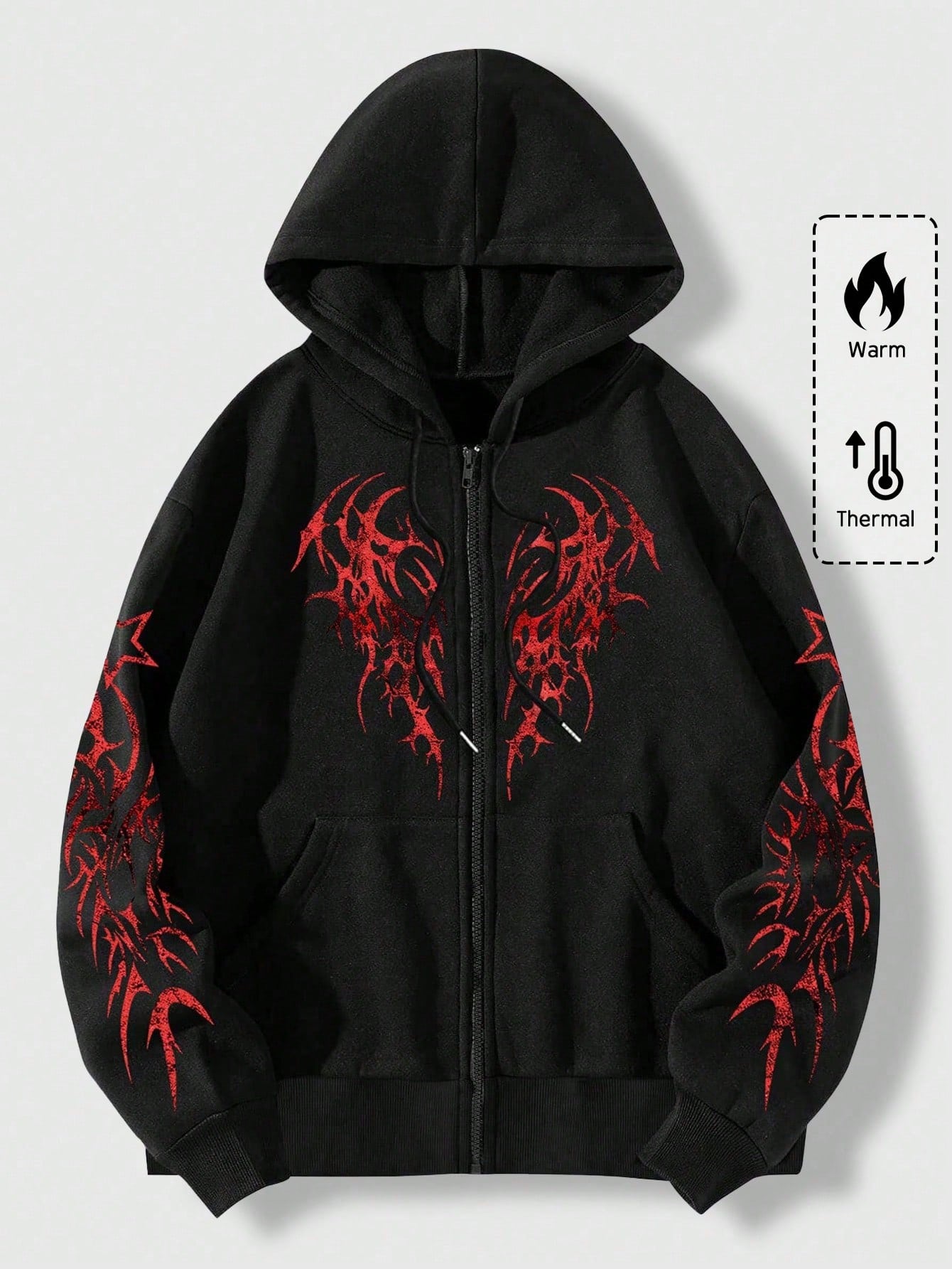 Grunge Punk هودي رجالي مطبوع بطباعة جرافيك مبطن حراريًا مع سحاب، للمدرسة، للخريف والشتاء