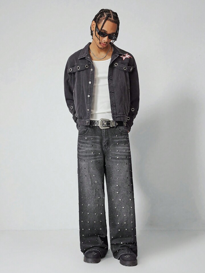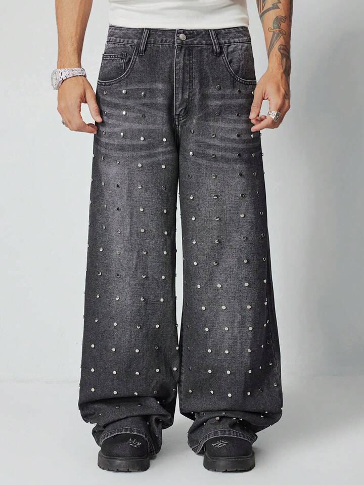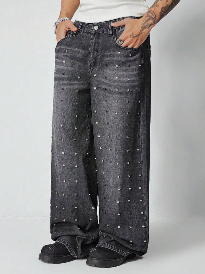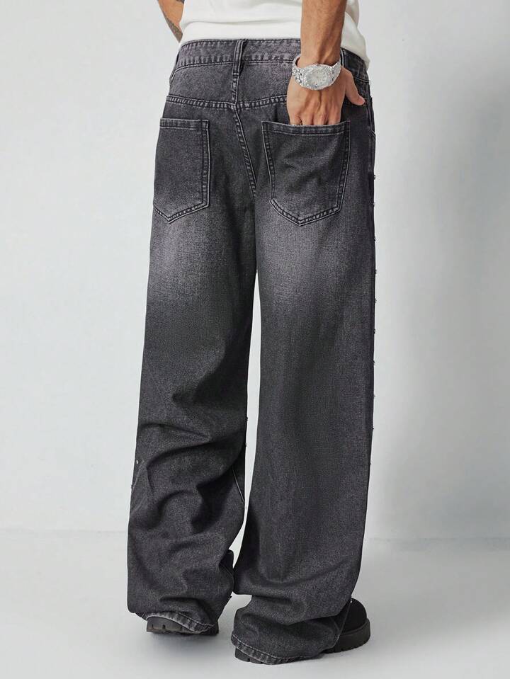Grunge Punk بنطال جينز واسع الساق بجيب مريح مناسب للرجال