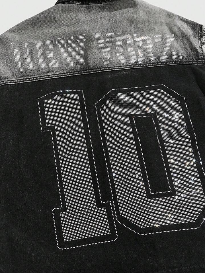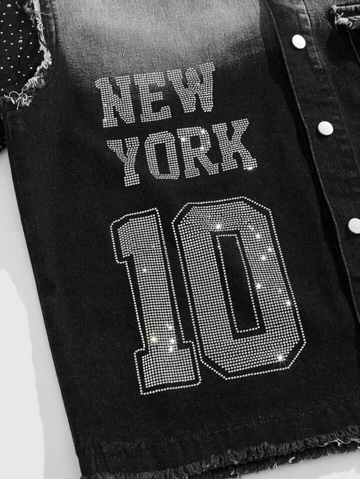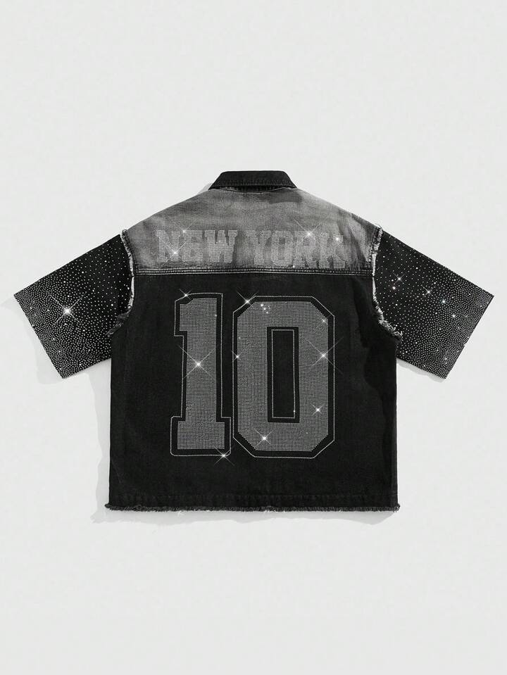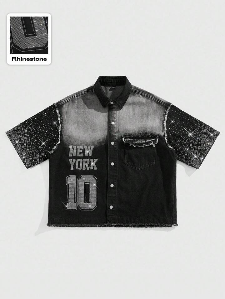 Grunge Punk قميص جينز بفحم مزين بحجر الراين للرجال