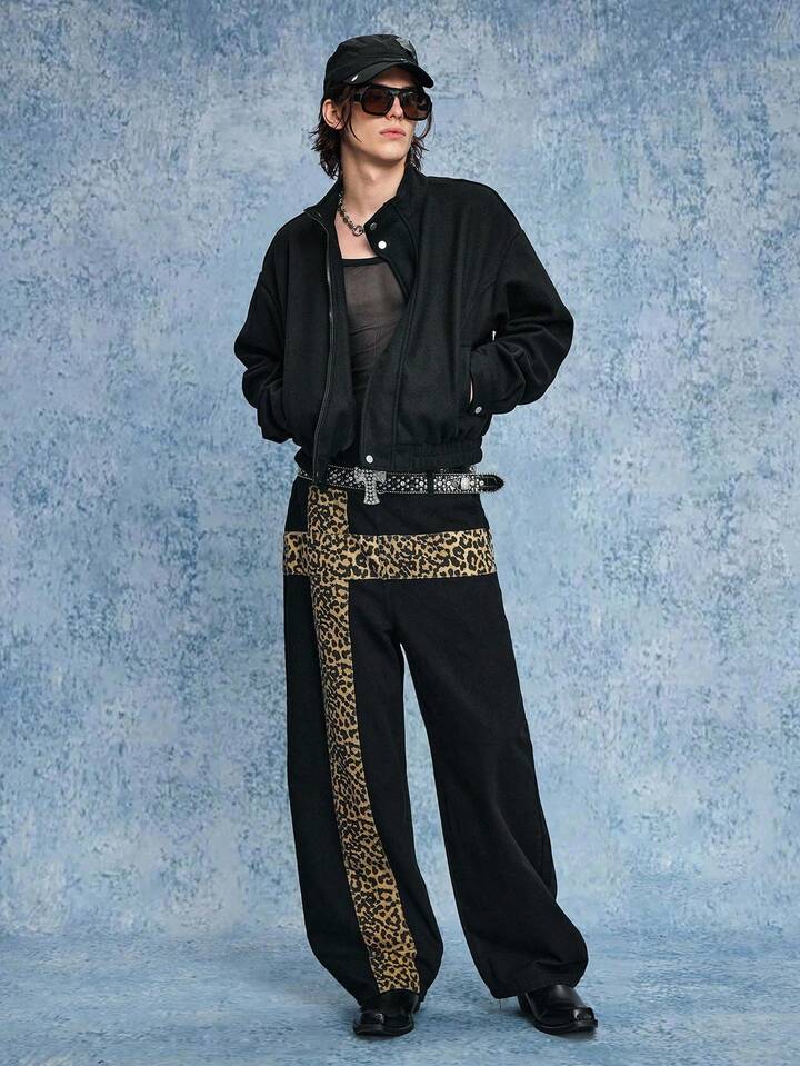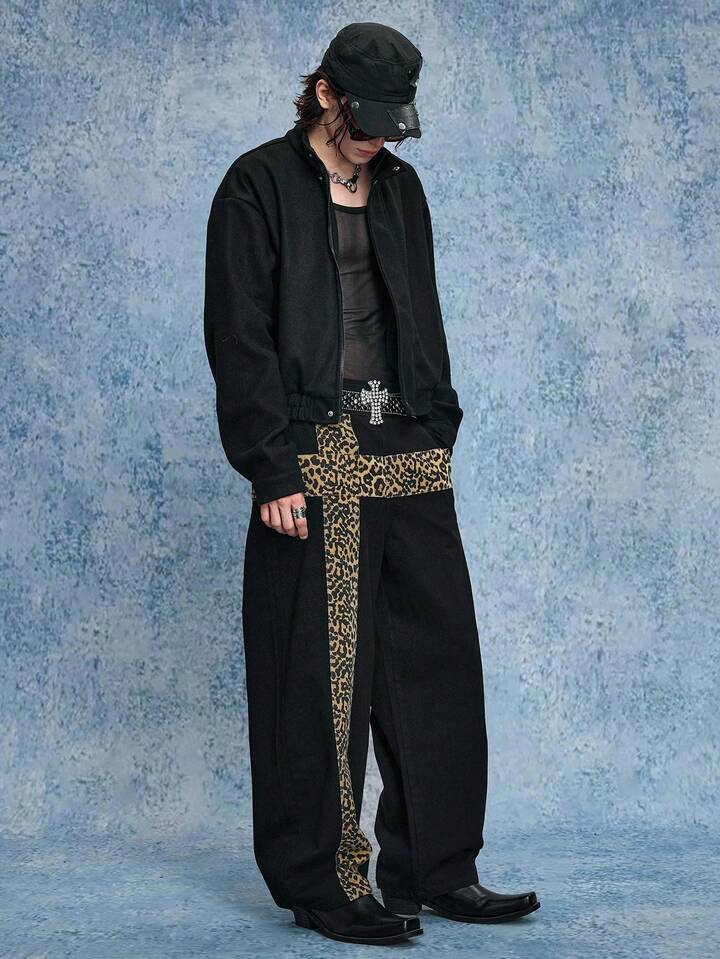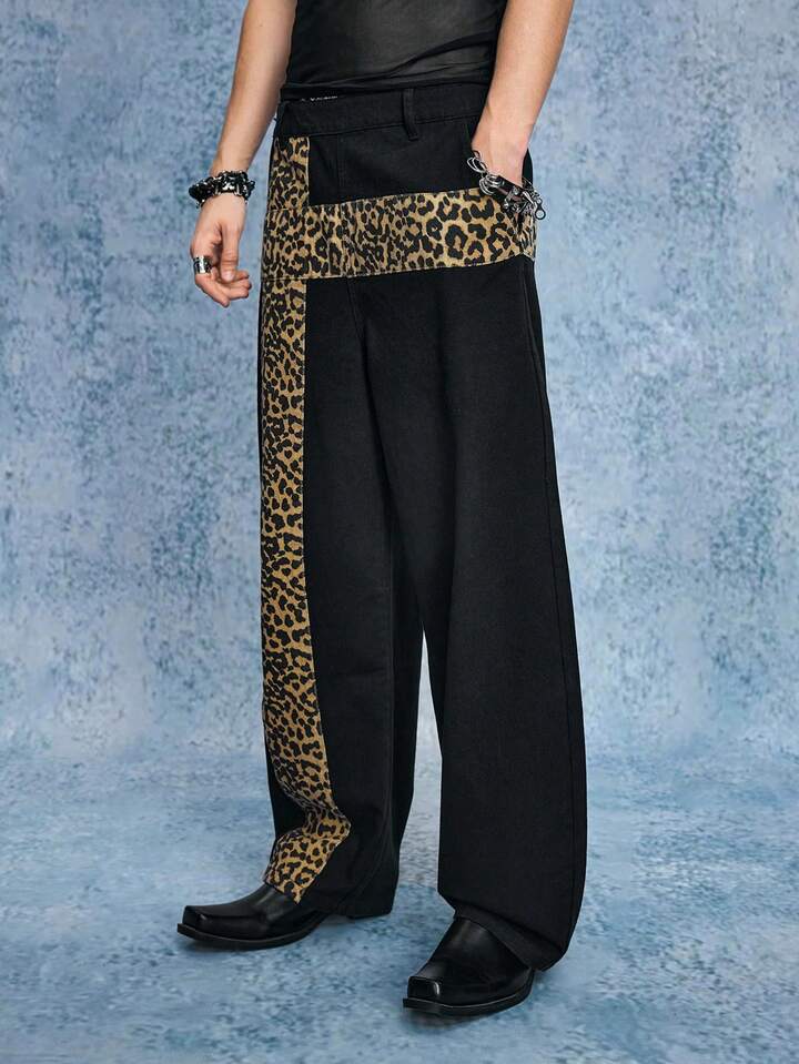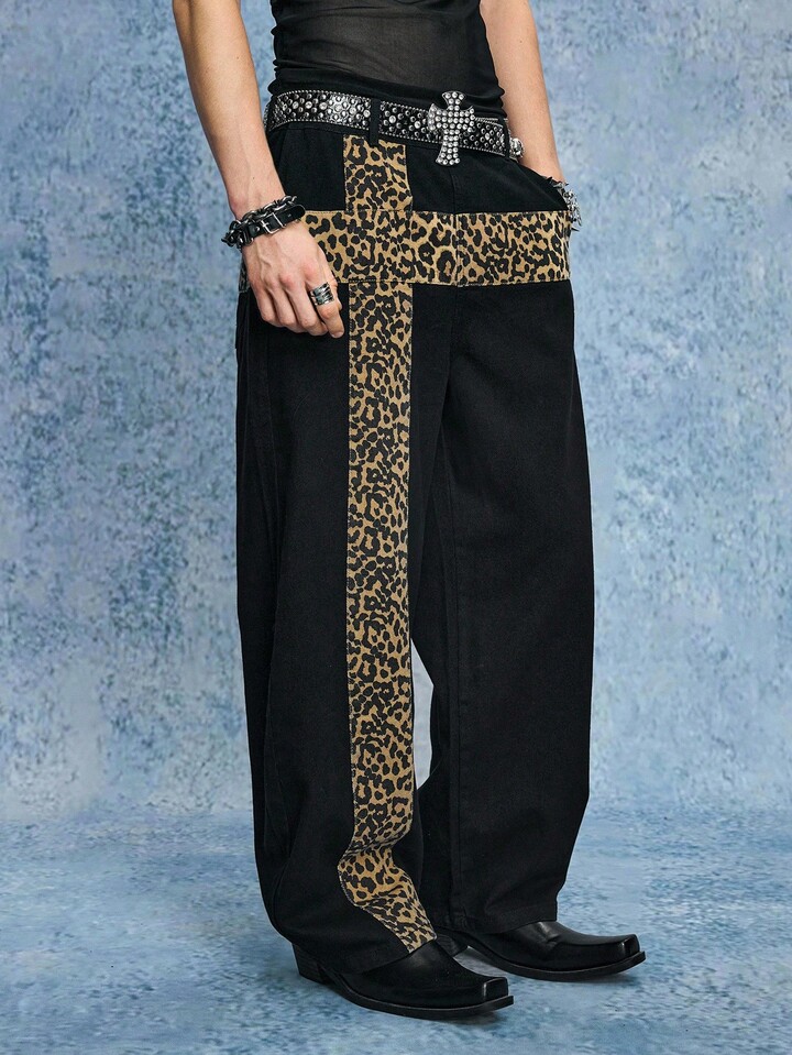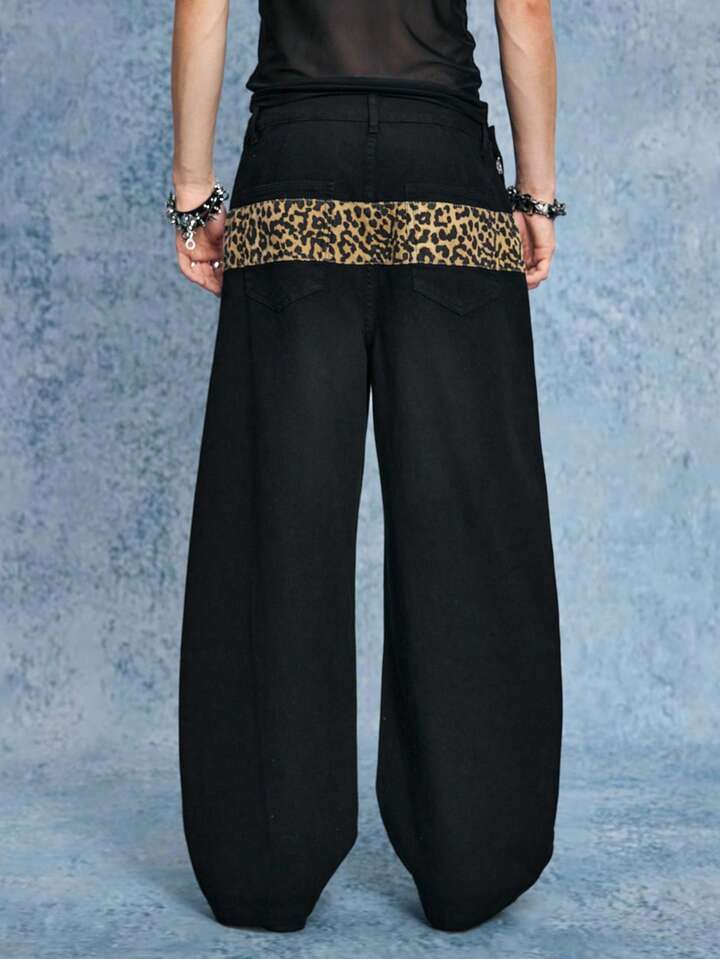 Grunge Punk بنطلون جينز رجالي فضفاض بقصة ساق واسعة مع طبعات جلد النمر والتصميم المرقع، طراز جرانج