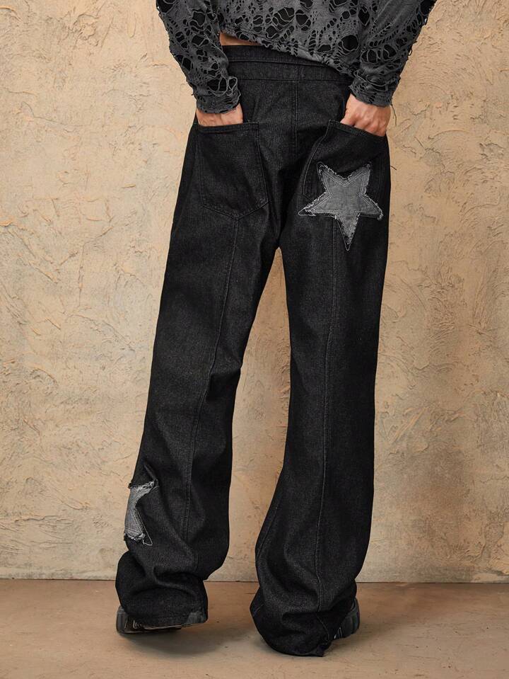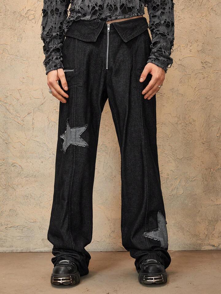Grunge Punk بنطلون جينز كاجوال بسيط للرجال مع سحاب أمامي وطراز نجمي
