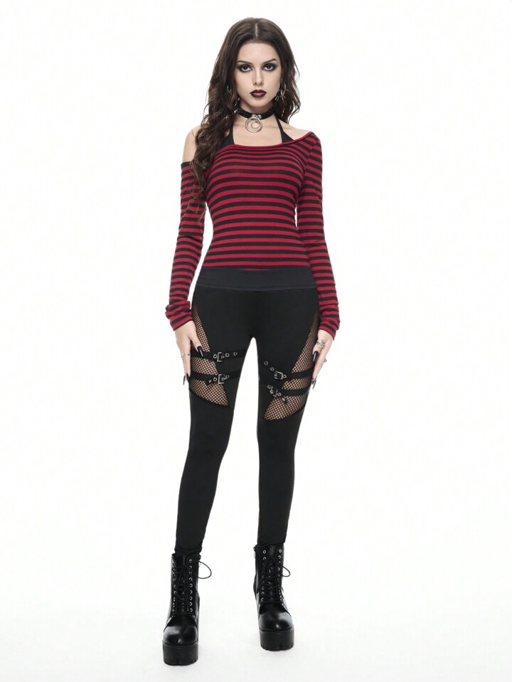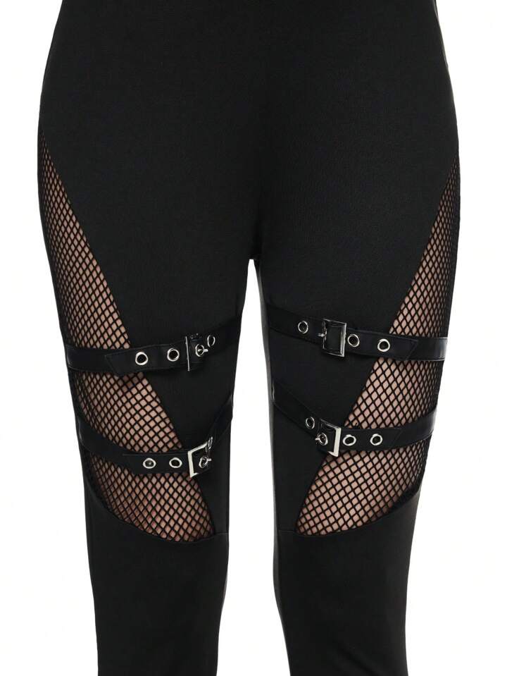 Grunge Punk سروال ضيق متوسط الخصر بتصميم شبكي مرقّع بالبراغي بطراز بانك