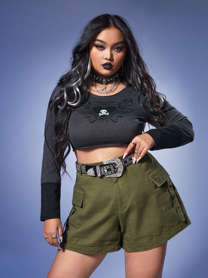 Grunge Punk بنطلون قصير جيب جانبي قلاب كارجو مقاس كبير