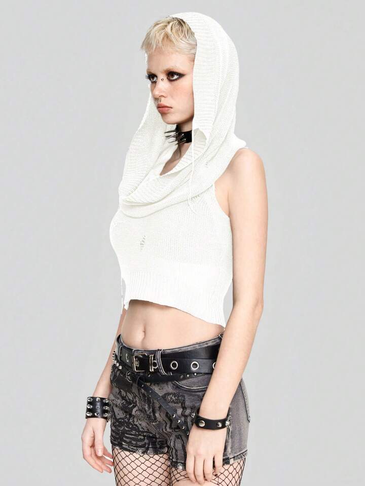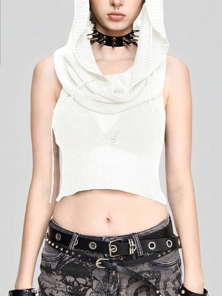 Grunge Punk هودي محبوك أنيق مقاس كبير بخامة خفيفة وتصميم مفتوح