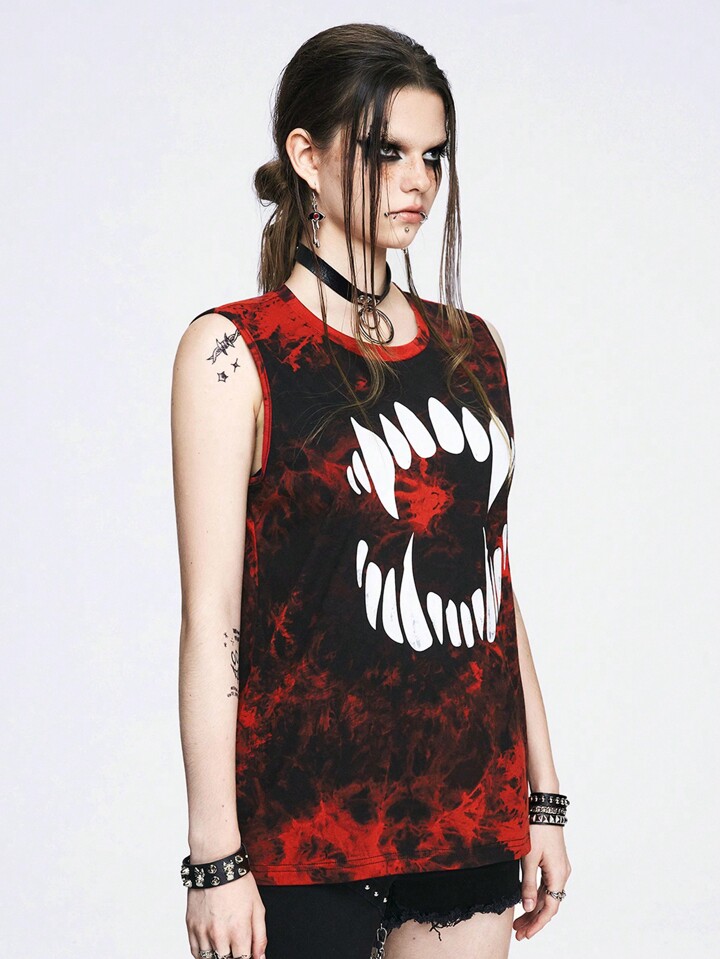Grunge Punk ملابس علوية بدون أكمام فضفاض مطبوع بألوان أسود وأحمر بتقنية تعتيق الربطة، بشعار الأنياب، للنساء