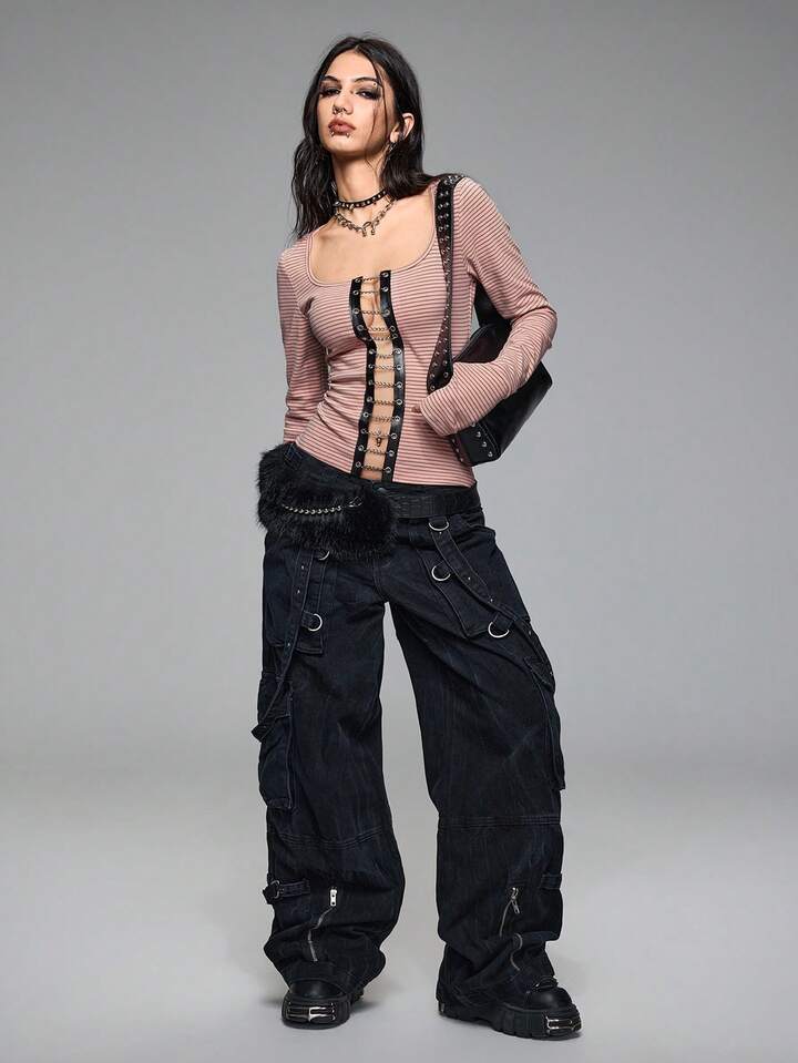 Grunge Punk ملابس علوية ضيقة بياقة طاقم مفرغة من الأمام، مصنوعة من قماش البولي يوريثان المرقع بخطوط سوداء ورمادية، مع سلسلة معدنية