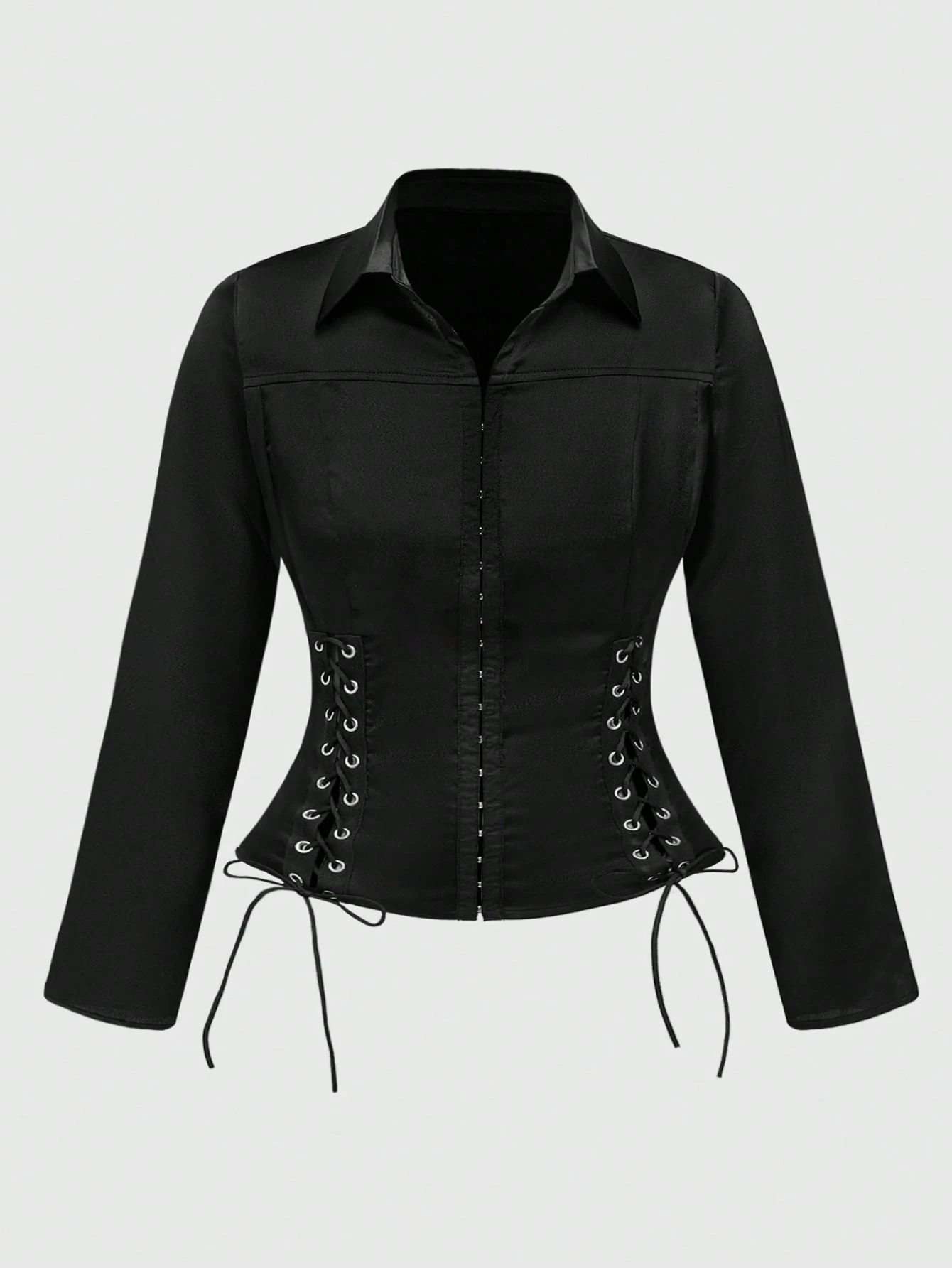 Grunge Punk قميص أسود للمقاسات الكبيرة بياقة مفتوحة وربطة عنق نمط التجعيد من الأقمشة الجلدية العاكسة، طراز بنكي وجذاب
