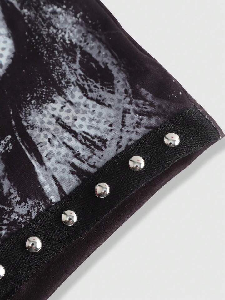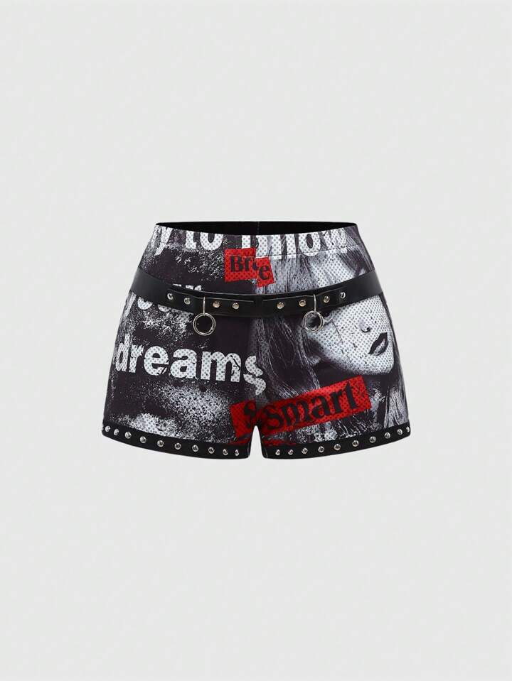Grunge Punk شورت نسائي ذو خصر منخفض بطبعات شعارات سيرين جذابة باللون الأسود والأحمر والأبيض، مزين بدبابيس معدنية، طراز كوري