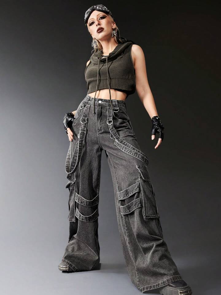 Grunge Punk بنطال جينز صديقة البني الثلجي لديه تفاصيل أشرطة وجيب رديف، مناسب للمدرسة