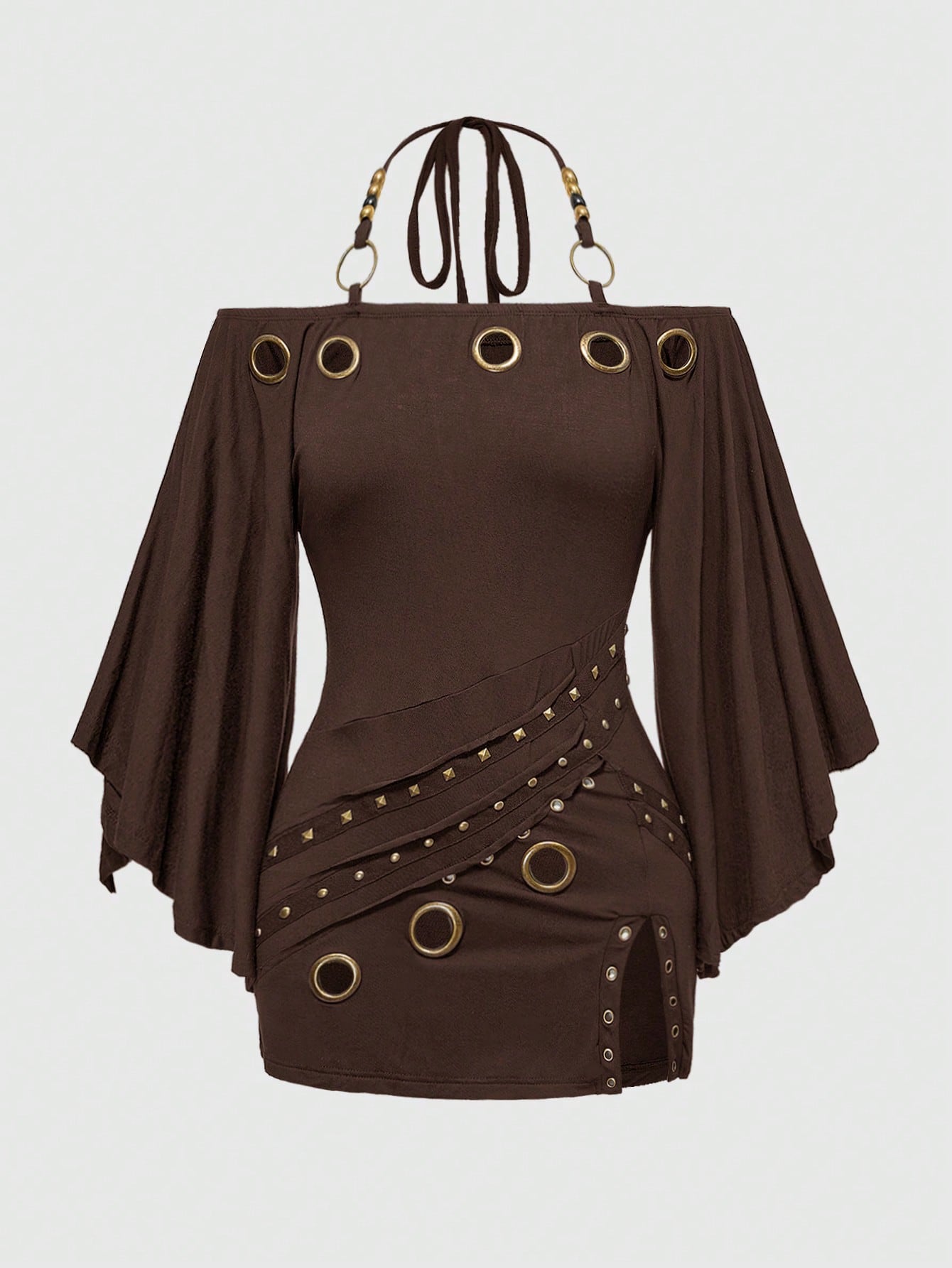 Grunge Punk تي شيرت نسائي بأكمام خفيفة على الكتف مع ديكور معدني مثقوب بطراز عتيق