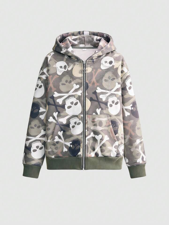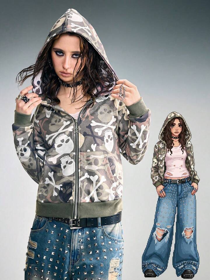 Grunge Punk بلوزة رياضية مزودة بسحاب مع طبعة جمجمة وكاموفلاج وحلقات راين ستون وياقة فرو