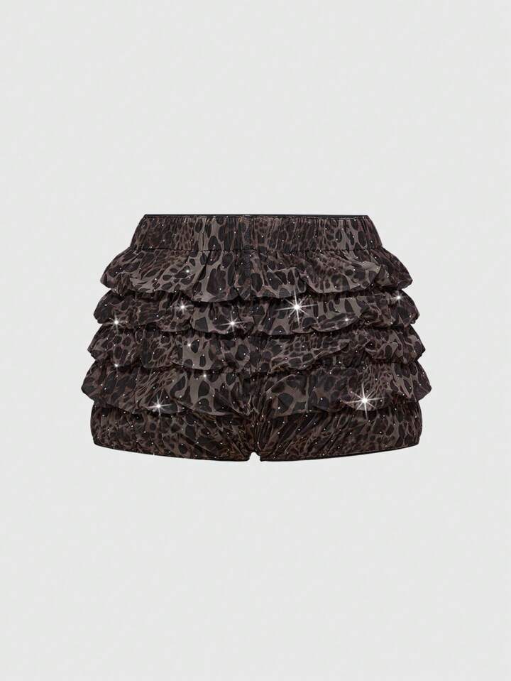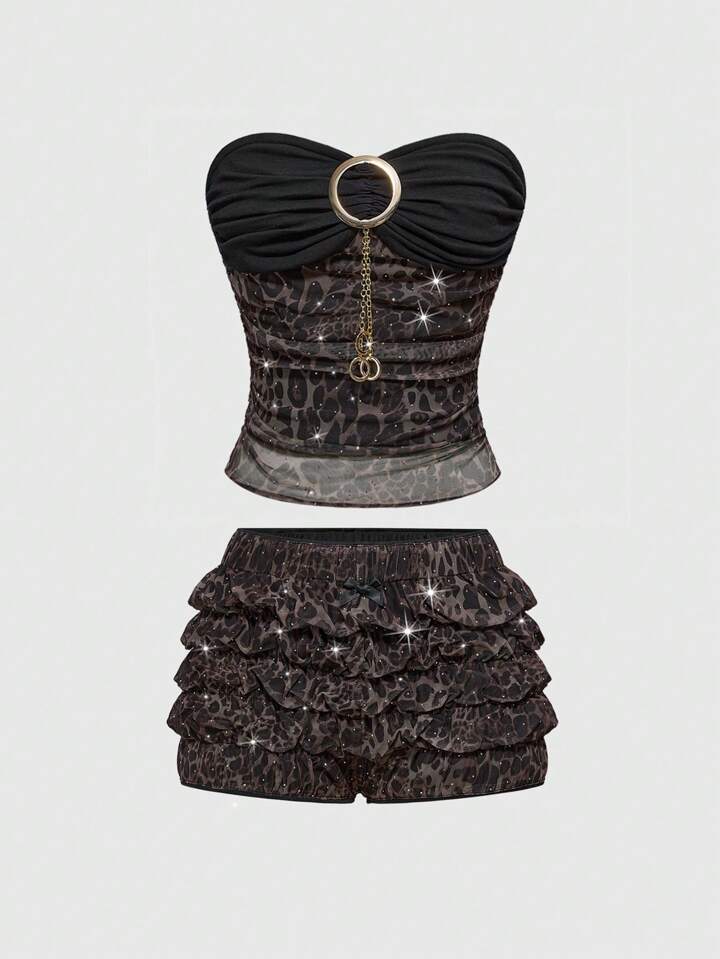 Grunge Punk مجموعة قطعتين لموسم المهرجانات الموسيقية الصيفية، تتكون من: طوق معدني مرصع بالراين ستون بطبعة نمر فهد رجعية شيك وقميص محصور مع شورت قصير بطبعة نمر فهد مفصل بقصة كشكشة خصر منخفض للغاية