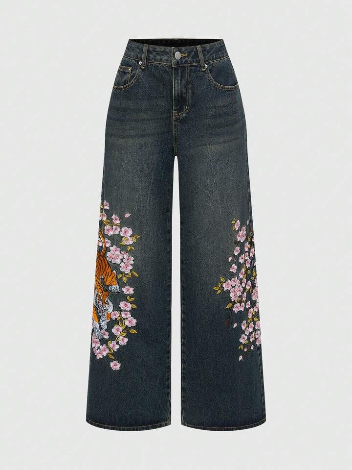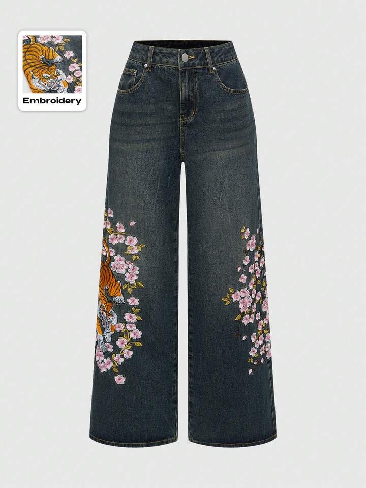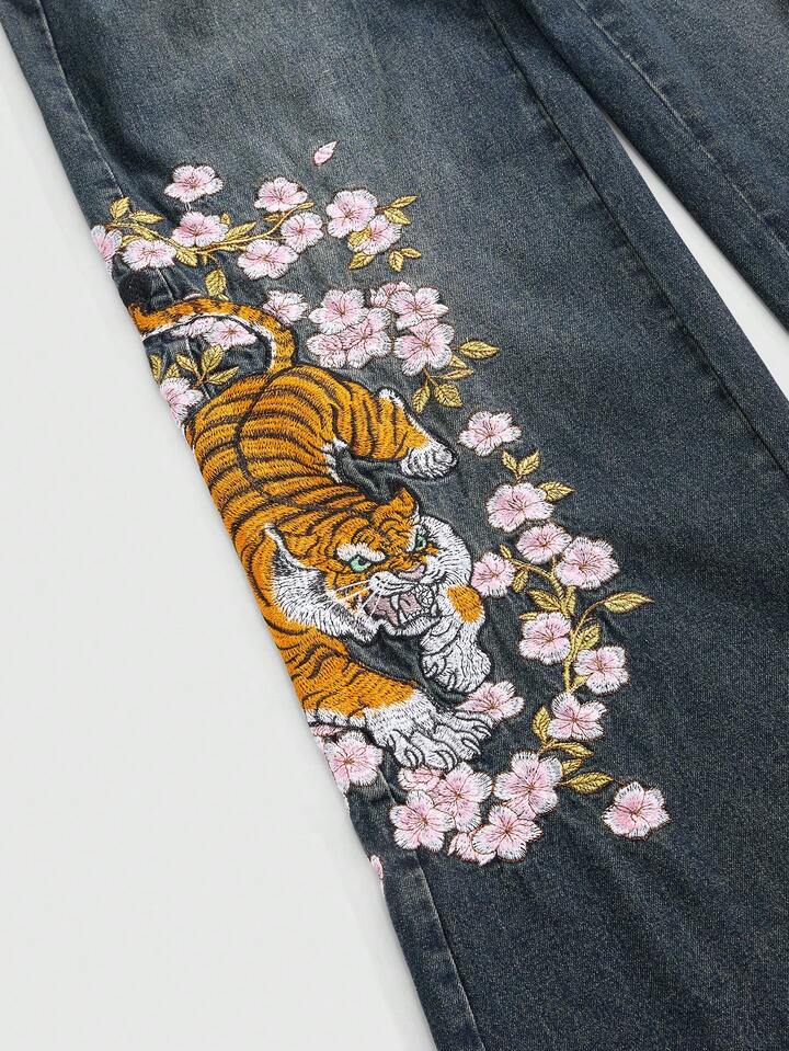 Grunge Punk بنطلون جينز فضفاض بقصة واسعة للجنسين بطراز شارع رجعي مطرز بنمر صيني وزهور الكرز