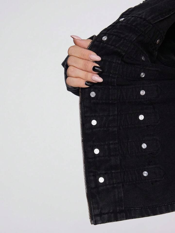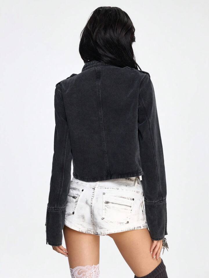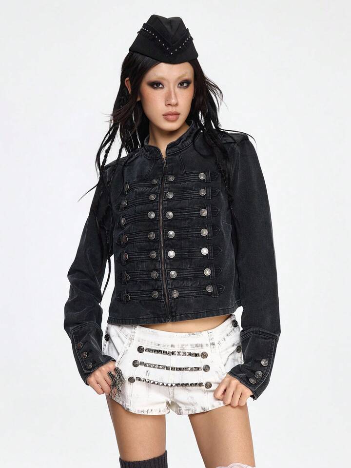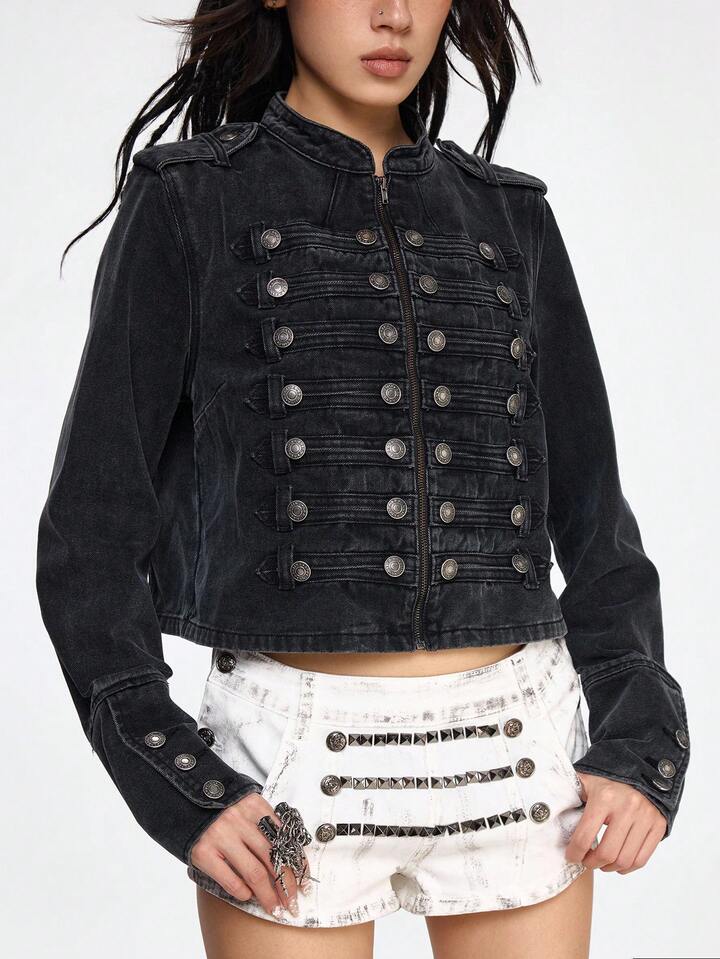 Grunge Punk جاكيت جينز مبهتة بإغلاق معدني بنمط بحري بانك فينتاج