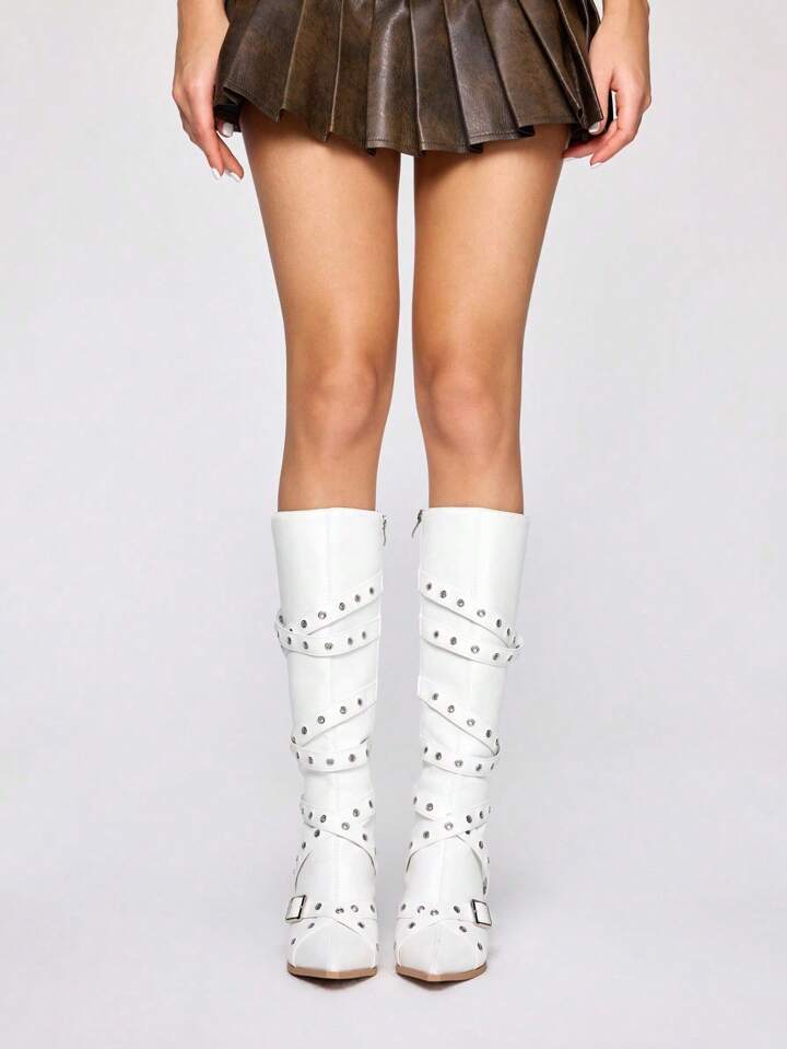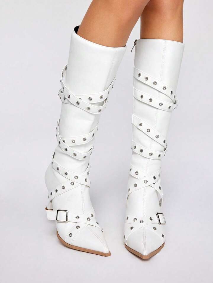 Grunge Punk بوت نسائية بكعب عالي بنمط جوتيك، أصبع قدم مدبب، حزام إبزيم، طول الكاحل، مناسبة لعيد الهالوين